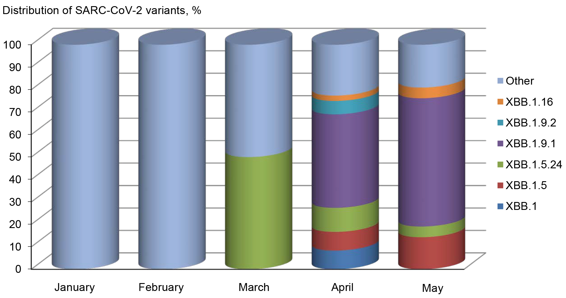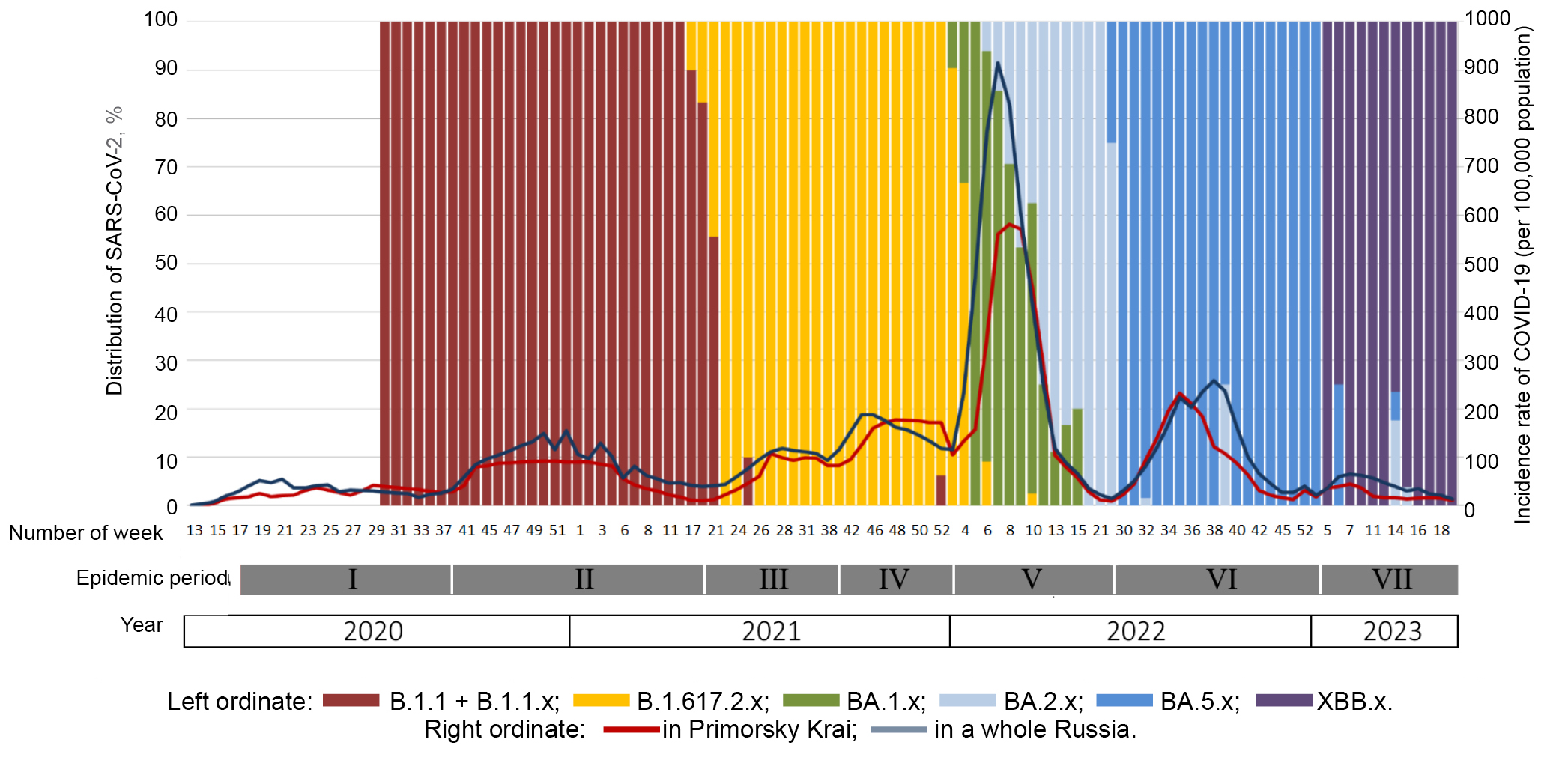 Results. When analyzing the epidemic dynamics of COVID-19 in Primorsky Krai (2020–2023), 7 rises in incidence with different clinical and epidemiological symptoms depending on the genetic variants of the pathogen were identified. At the beginning of the pandemic in Primorsky Krai, as well as throughout Russia, Wuhan-like variants of SARS-CoV-2 were predominant, though later, Delta and Omicron genetic variants were in the majority. By the end of April — beginning of May 2023, the proportion of Omicron sub-variants (XBB.1.9.2 and XBB.1.16) in Primorsky Krai was higher than the Russian average and comparable to that in neighboring countries (Republic of Korea and Japan).
