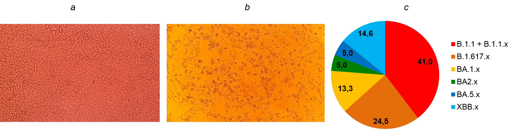 Isolation of SARS-CoV-2 strains was performed from qPCR-positive samples of nasopharyngeal washings, clarified by low-speed centrifugation and filtered through Millex (Merck) nozzles with a pore diameter of 0.22 μm, on the Vero E6 cell line model (kidneys of the African green monkey), which was cultured in plastic tubes (Nunc) with a slanted bottom of 5.5 cm2 in DMEM medium (BioloT) supplemented with 1% fetal calf serum (PanEco), 100 U/ml gentamicin at 37ºC in an atmosphere of 5% CO2 [25, 26]. The efficiency of virus isolation was evaluated by decreasing the threshold cycle of PCR in 3 consecutive passages. On the 5th day after infection, the culture fluid was taken for RT-qPCR (after the 3rd passage, we additionally determined lg of the 50% tissue culture infectious dose (lg TCID50) using the MTT test).