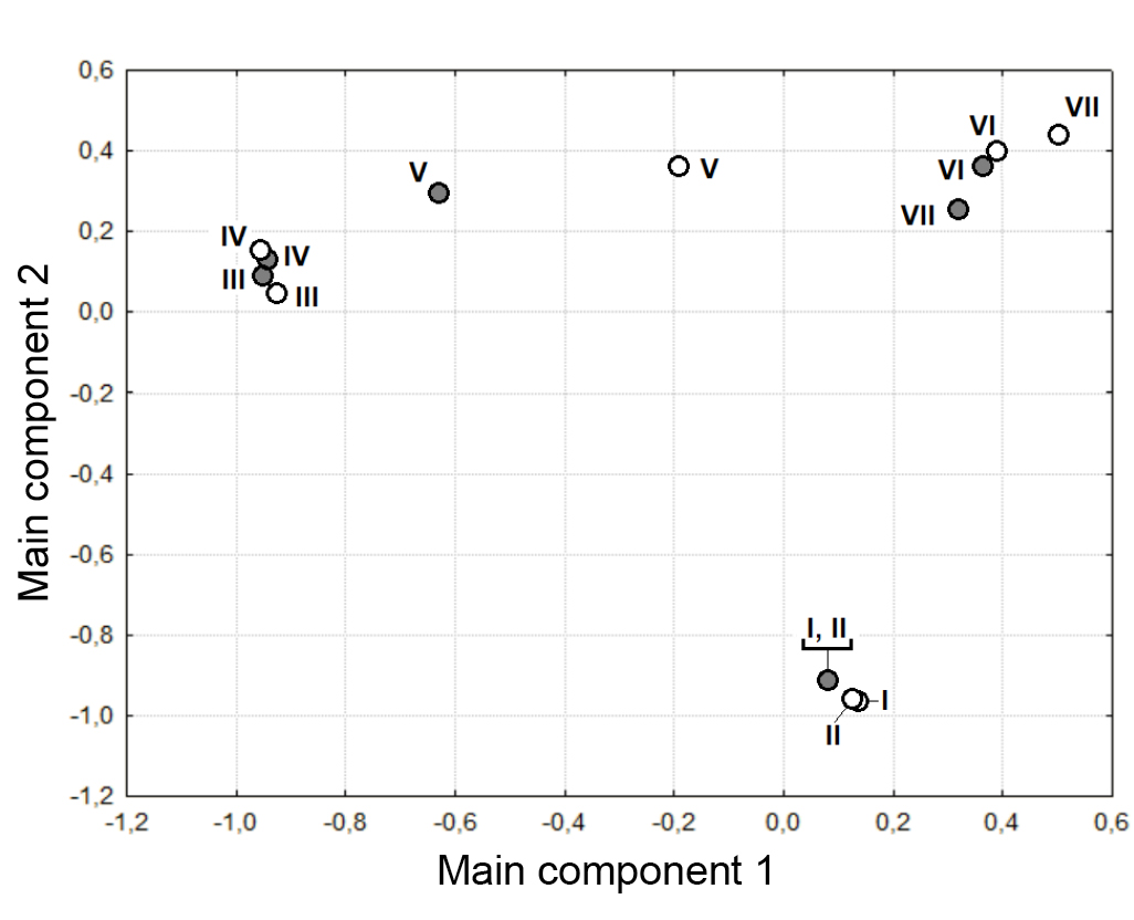 The method of principal components as a way to find a subspace of lower dimensionality, in projection on which the initial data have the smallest spread of quadratic deviations [31, 32], was applied using the software packages "Statistica v. 7.0" ("StatSoft Inc.") and "Mathworks Matlab R2007b" software packages.