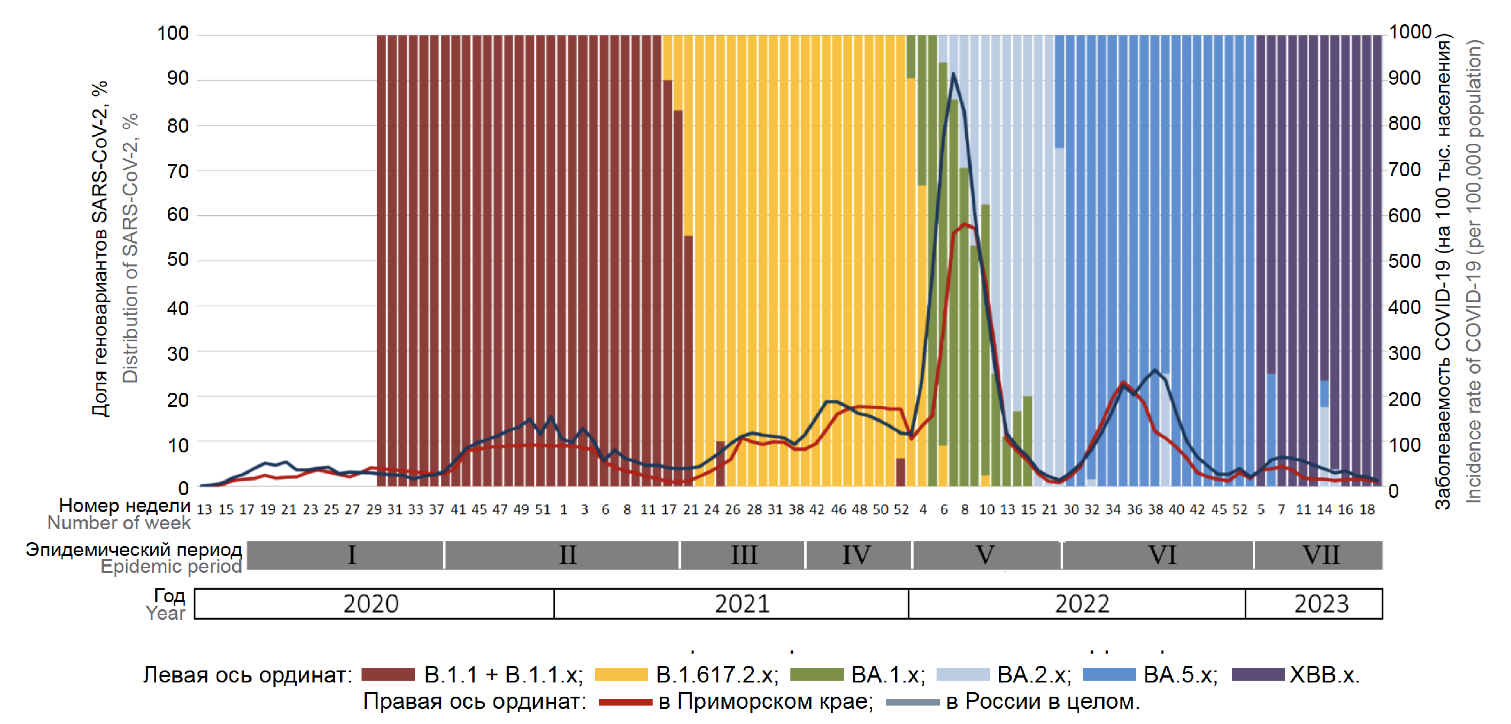 Results. When analyzing the epidemic dynamics of COVID-19 in Primorsky Krai (2020–2023), 7 rises in incidence with different clinical and epidemiological symptoms depending on the genetic variants of the pathogen were identified. At the beginning of the pandemic in Primorsky Krai, as well as throughout Russia, Wuhan-like variants of SARS-CoV-2 were predominant, though later, Delta and Omicron genetic variants were in the majority. By the end of April — beginning of May 2023, the proportion of Omicron sub-variants (XBB.1.9.2 and XBB.1.16) in Primorsky Krai was higher than the Russian average and comparable to that in neighboring countries (Republic of Korea and Japan).
