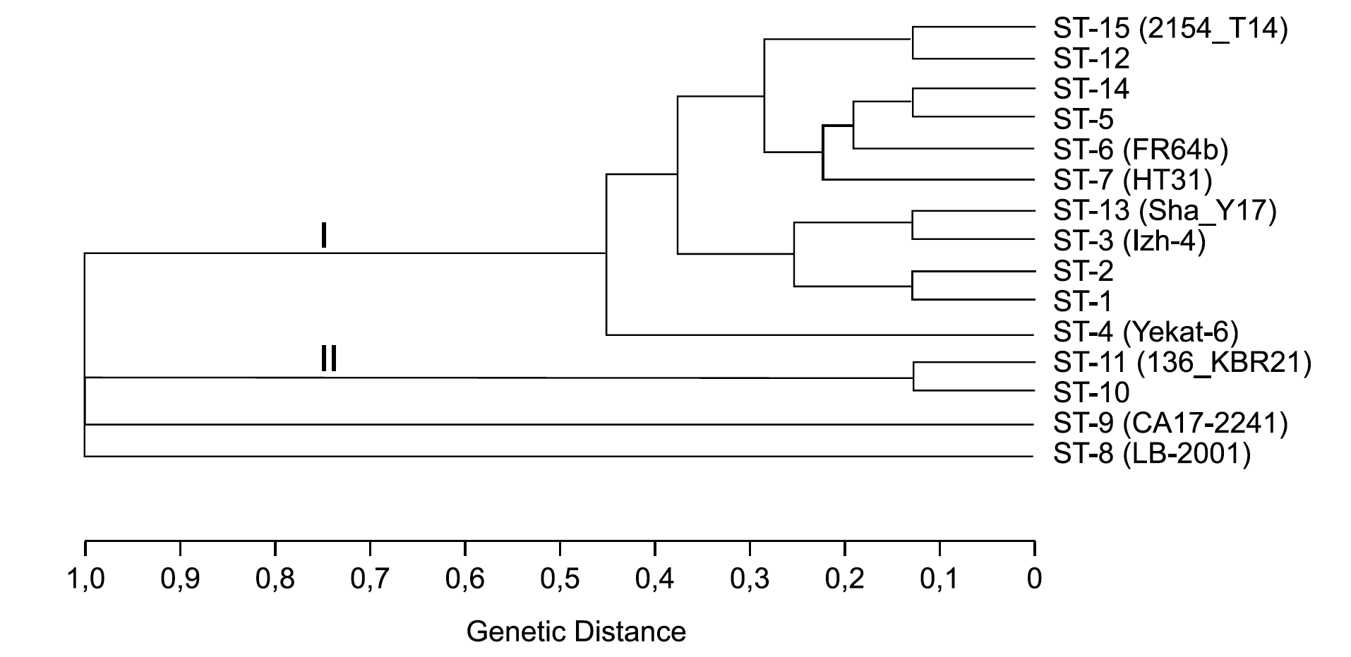 The first clonal complex (I) brings together 11 STs which are found in 80 (88%) of the characterized strains and DNA samples. ST-14 can be designated as the central one, because the allelic profile corresponding to it has the maximum number of mismatches at 1 MLST locus from the allelic profiles of other STs of this clonal complex, equal to 4. The second clonal complex (II) is formed by ST-10 and ST-11 which are found in 8 (8.7%) DNA samples and 1 (1.1%) strain. The allelic profiles of ST-10 and ST-11 have mismatches at 1 MLST locus and differ from the allelic profiles of the first clonal complex STs at all 8 MLST loci.