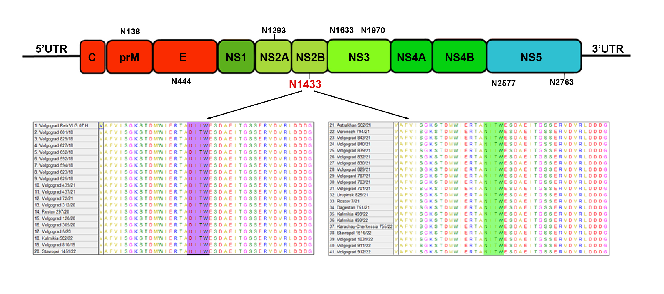 We analyzed 44 amino acid complete coding sequences of WNV isolates isolated in 2018–2022 in Russia and performed a comparative analysis with the genotype 2 reference NC_001563, as well as with isolates circulating in Europe. We have identified a number of glycosylation sites that are common to WNV isolates circulating in Russia and European countries. It is known that glycosylation sites play a key role in the interaction of the virus with host cells and they are the so-called hot spots in the adaptive variability of WNV. Also, a potential glycosylation site at position N1433 of the NS2B protein was identified for the first time in a number of isolates isolated in 2021 and 2022 in Russia (Figure). Interestingly, this mutation is absent both in the genotype 2 reference and in isolates from European countries. The study did not show that isolates possessing this glycosylation site are confined to specific territories or to currently known genetic variants of genotype 2 of WNV.