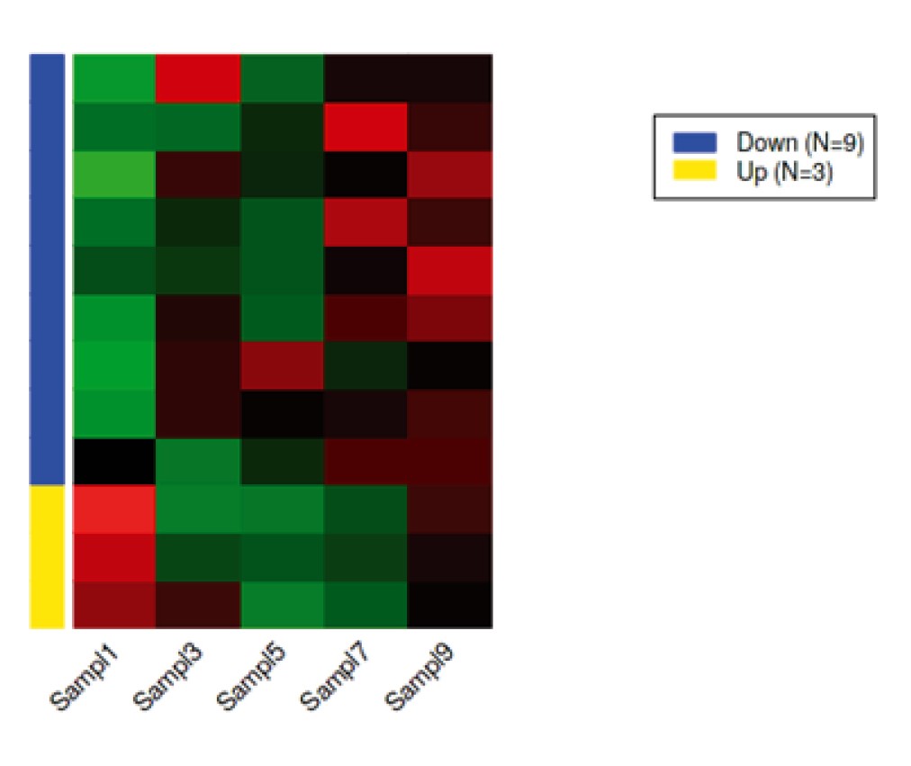 The heatmap of the expression genes for the selected samples is shown in Fig. 3. Changes in gene expression are shown by a scale ranging from –3 for down-regulation (green) to 3 for up-regulation (red).