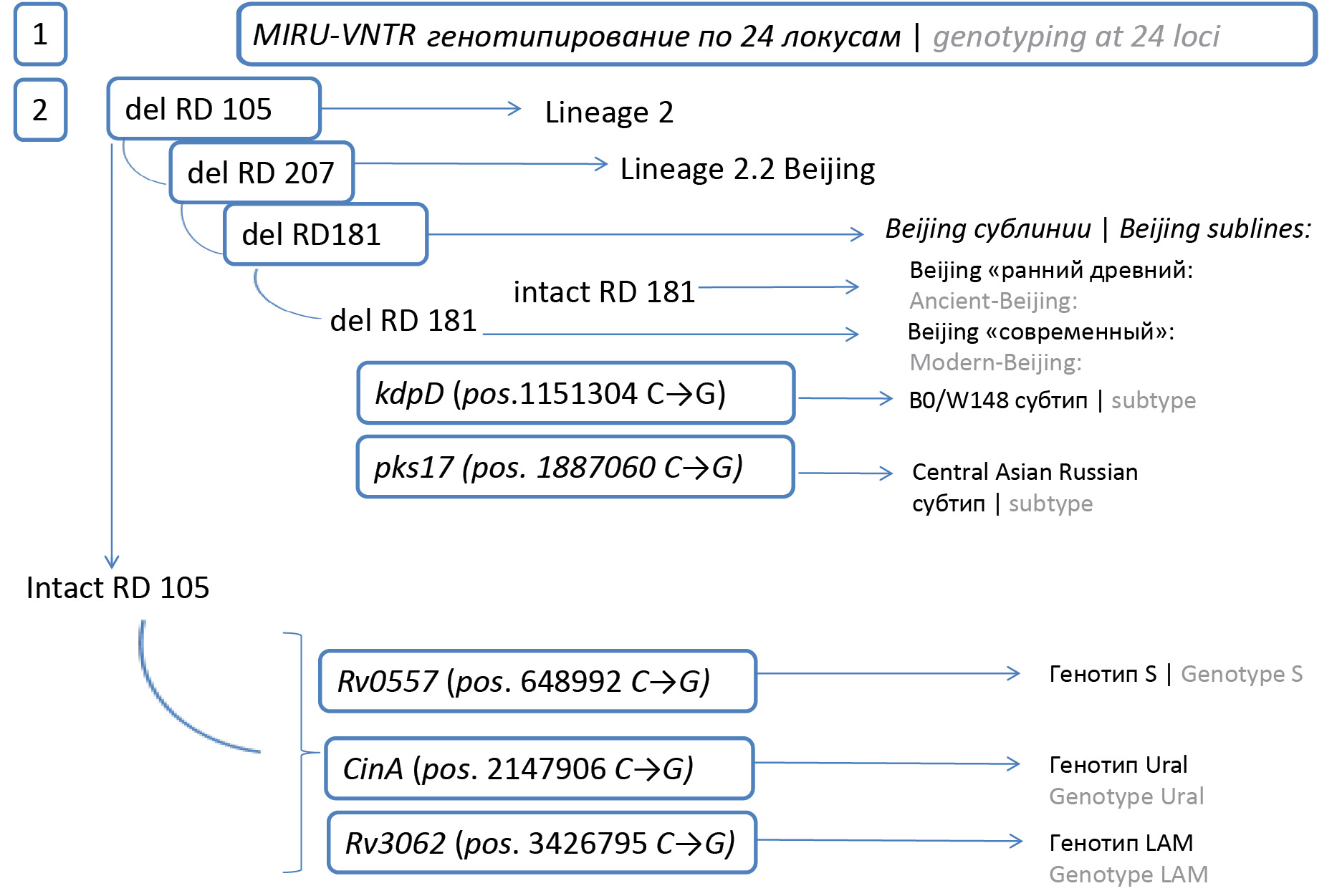 Для определения генотипической структуры популяции МБТ использовали комбинацию молекулярных методов развёрнутой схемы генотипирования и экспресс-методы SNP-анализа — выявление маркеров генотипов по специфическим для них SNP. Первым этапом был проведён делеционный анализ по регионам различия RD 105 и 207 всех образцов, который разделил выборку на 2 группы, из них 110 (67,5%) из 163 изолятов принадлежали к Beijing-генотипу, остальные 52 определены как non-Beijing и 1 смешанный образец (Beijing/non-Beijing — mix). Все Beijing-штаммы имели делецию в регионе различий RD 181, они отнесены к современной подлинии этого генотипа.