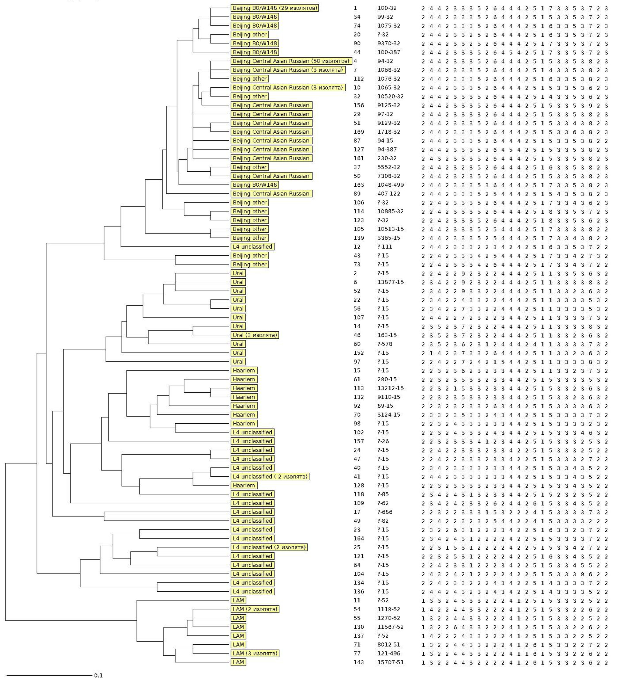 Каждая строка содержит данные изолята с идентифицированным генотипом в жёлтом блоке с указанием количества в случае выявления идентичных профилей; идентификационного номера изолята; MLVA MtbC15-9 типа; числа повторов в каждом из 24 локусов.