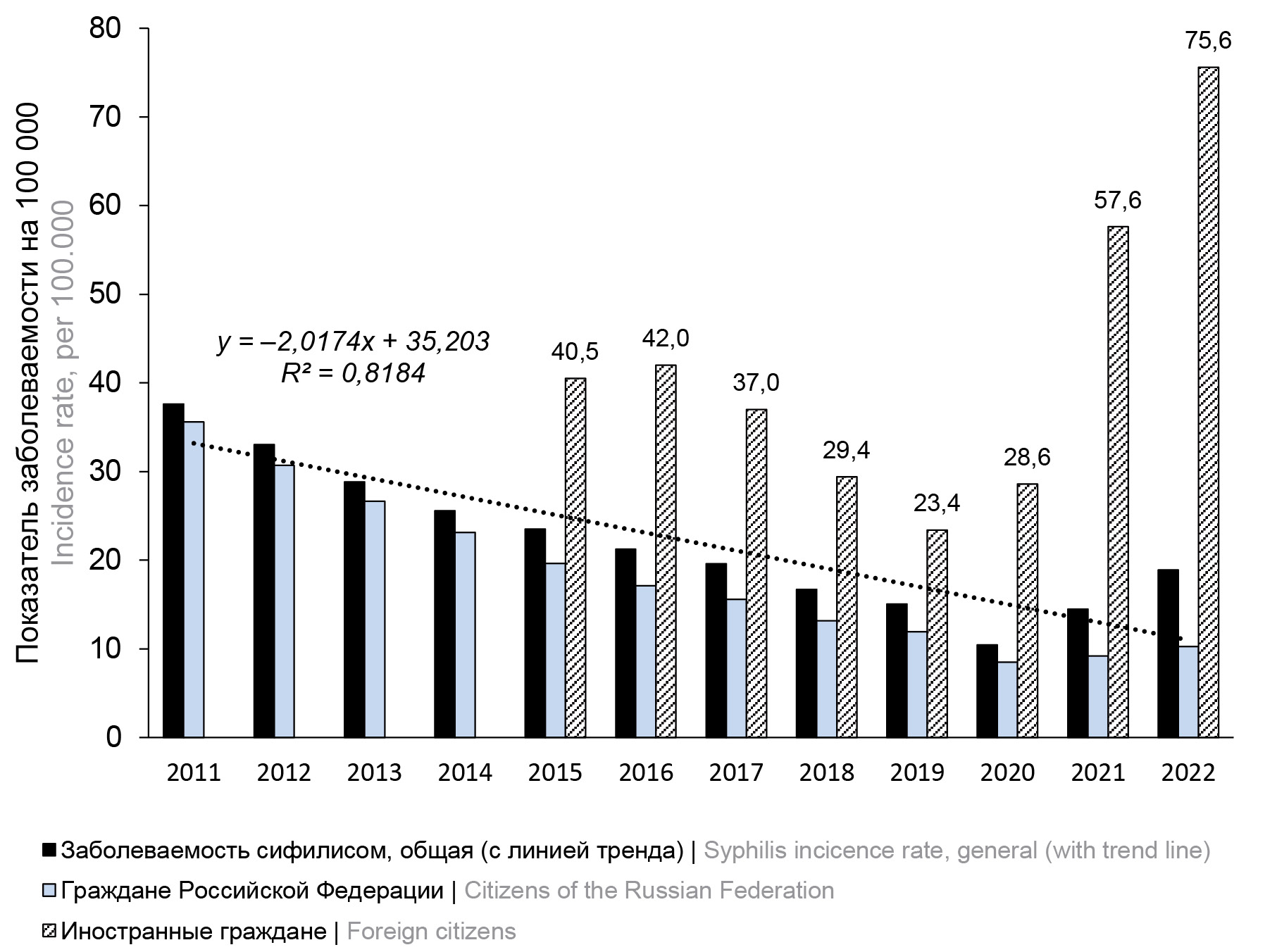 Material and methods. A retrospective epidemiological analysis of the incidence of syphilis among the population of the Russian Federation and foreign migrants was performed. The data from Federal Statistical Monitoring Form No. 9 and No. 34 was used with reference to STIs incidence in 2011–2022 in Russia and in its regions.