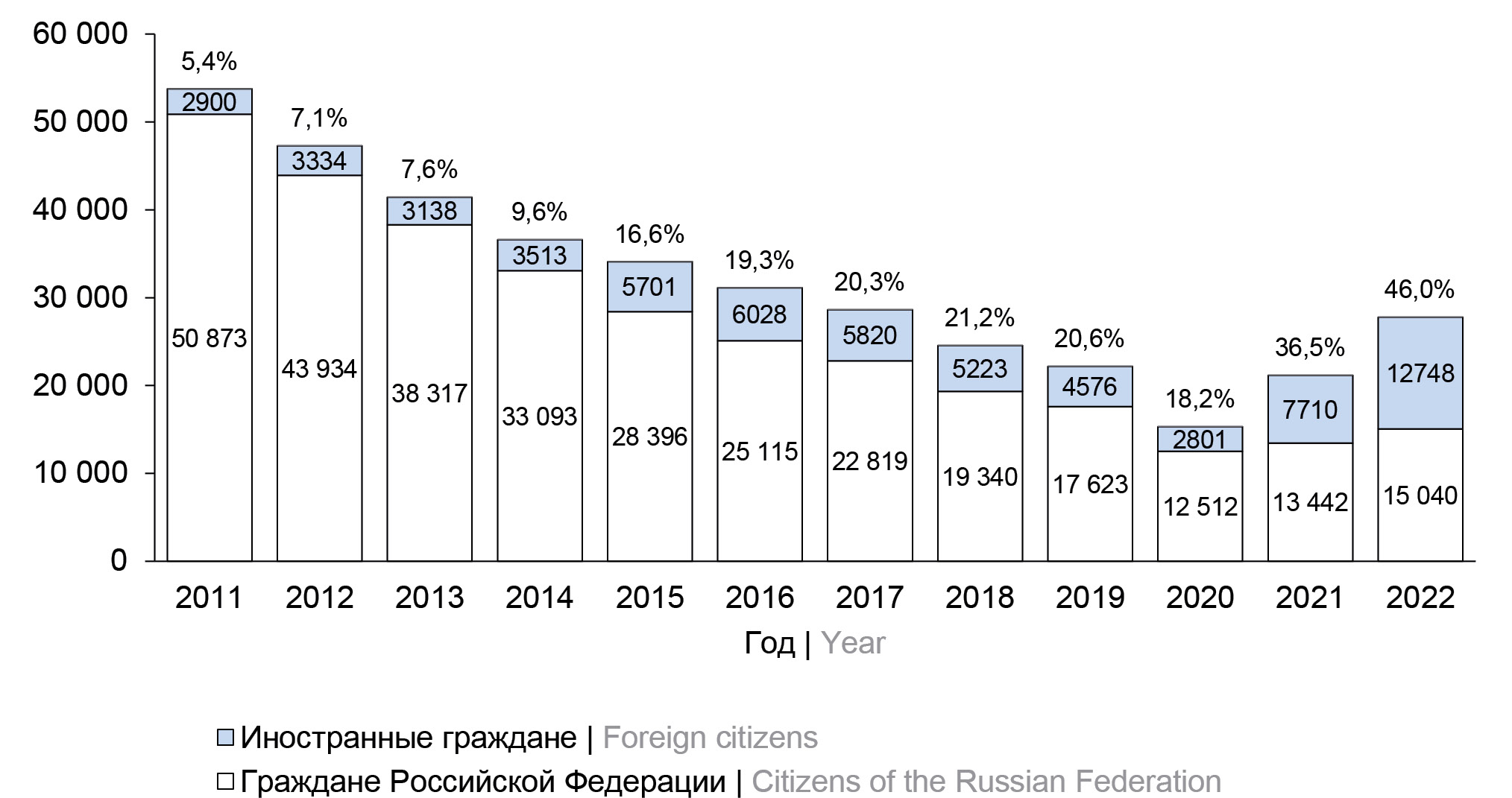 Рис. 2. Число случаев сифилиса, зарегистрированных среди граждан Российской Федерации и иностранных граждан-мигрантов (абс.), и их доля в общей структуре заболевания (%) в 2011–2022 гг.