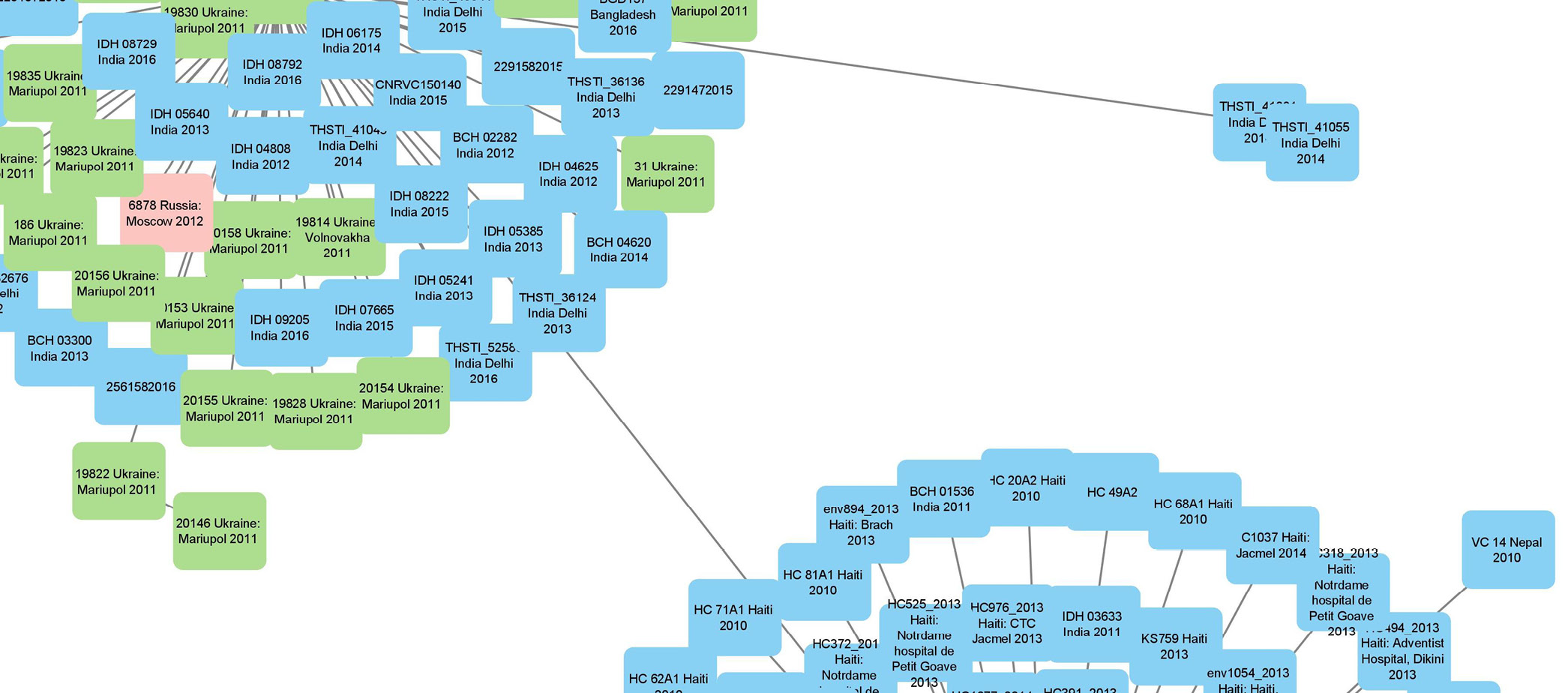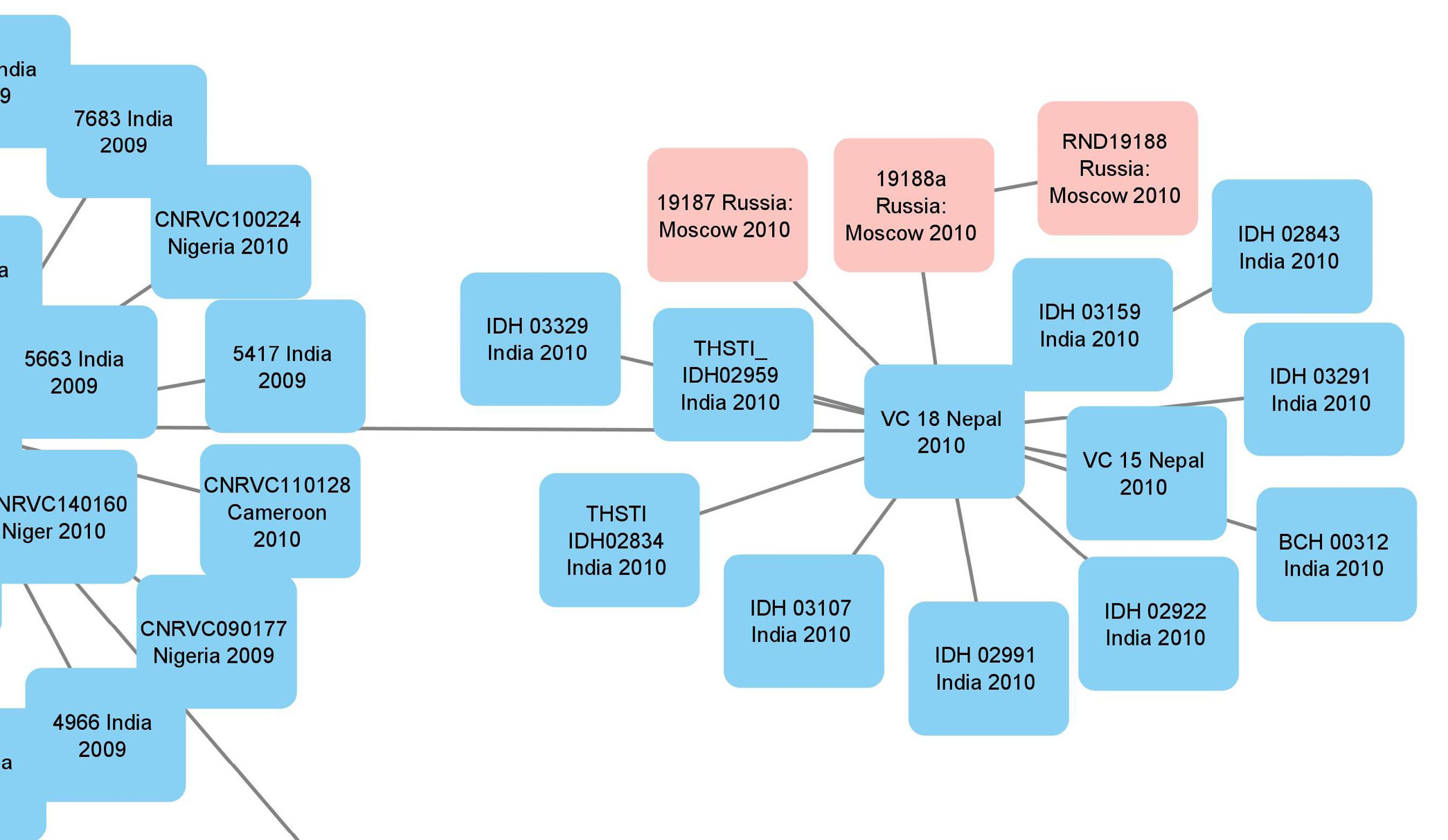 Рис. 2. Фрагмент дендрограммы, отражающей близость штаммов V. cholerae, выделенных в Москве, к штаммам из Индии и Непала. Для каждого штамма указаны номер штамма, место и год выделения.