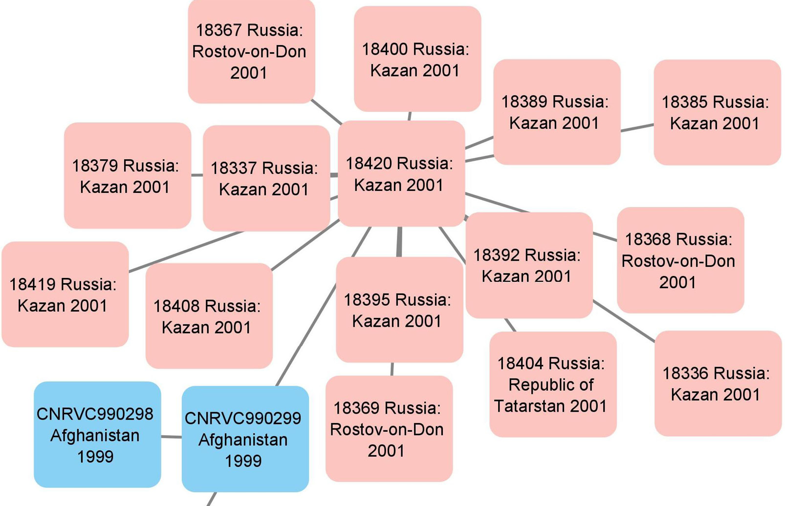 В ходе эпидемиологического расследования вспышки холеры (52 больных и 18 вибриононосителей) в Казани в 2001 г. было высказано предположение о завозе возбудителя из-за рубежа [28]. В рамках настоящего исследования установлено, что штаммы V. cholerae, выделенные во время вспышки в 2001 г., оказались генетически близки изолятам из Афганистана (рис. 5), а также штаммам, изолированным в Ростове-на-Дону (2001 г.). Примечательно, что близость между штаммами из Ростова-на-Дону и Казани уже была показана ранее по итогам VNTR-анализа [29, 30]