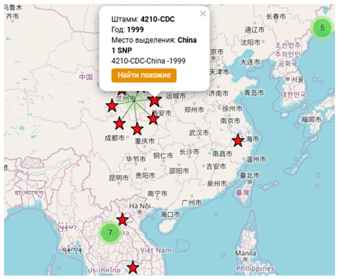 Для выборки и фильтрации штаммов на основе их генетической близости был создан серверный программный модуль, позволяющий выявлять генетически близкие варианты с помощью матрицы, построенной на предыдущем этапе. При нажатии на маркер штамма отображается диалоговое окно, содержащее краткую информацию о геноме и кнопку «Найти похожие», позволяющую выбрать все геномы, отличающиеся не более чем на 5 SNP. Для облегчения визуального анализа размер маркера отражает генетическую близость. Например, результат поиска близкородственных геномов штамма V. cholerae № I-1330, выделенного во Владивостоке в 1999 г., представлен на рис. 7. Стоит отметить, что наиболее генетически близкими данному штамму являются изоляты, выделенные в Китае, Камбодже и Лаосе, что, в свою очередь, коррелирует с данными, полученными другими авторами [32].