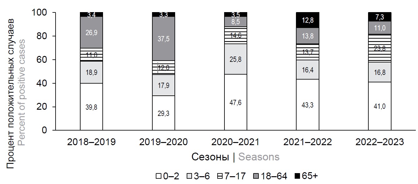 Over a 5-year period, starting from the 2018–2019 season, 18,458 patients hospitalized in ARVI wards with primary diagnoses of influenza, acute respiratory viral infection, pneumonia, acute bronchitis, and other manifestations of acute respiratory infections of varying severity were examined in 3 infectious diseases hospitals for adults and 6 multidisciplinary hospitals for children in St. Petersburg, Novosibirsk and Yekaterinburg. Analysis of the age distribution of the hospitalized (on average) showed a significant proportion of children (73.8%), including those aged ≤ 2 years (39.7%), 3–6 years (18.5%), 7–14 years (15.6%). The frequency of hospitalization of patients aged 15–64 years averaged 19.7% for the whole period, including patients aged 65 years and older — 6.5% (Table 1).