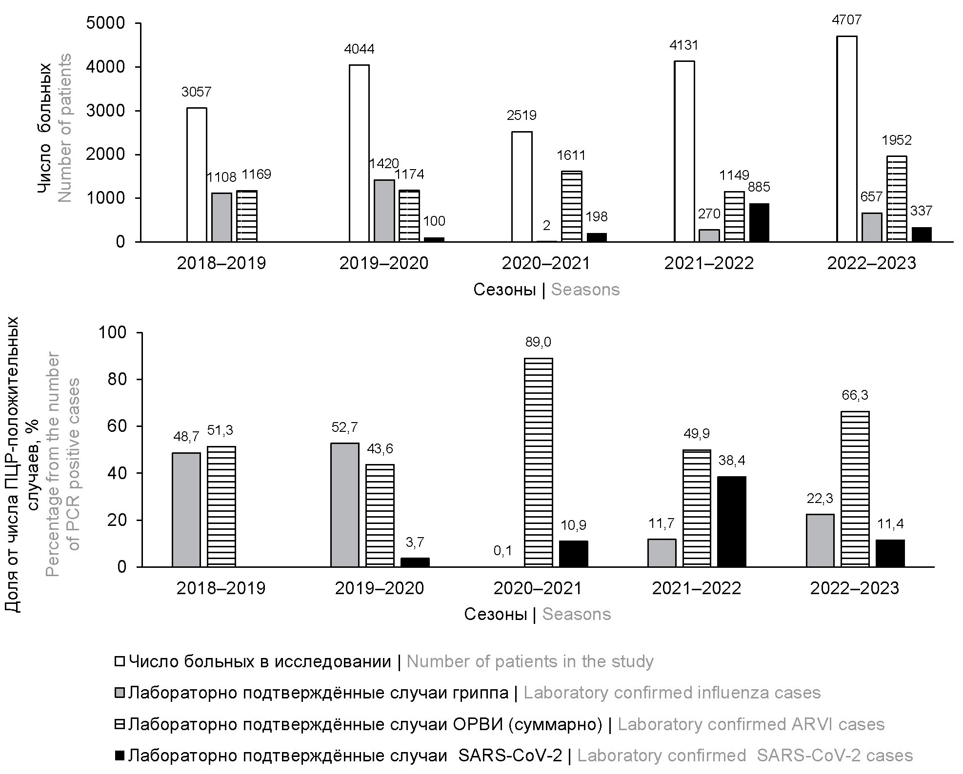 To be included in the study, patients had to have a combination of the following symptoms: 1 or more of 4 systemic symptoms: fever, weakness, headache, myalgia, and 1 or more of 3 respiratory symptoms: cough, sore throat, rapid breathing. The duration of the disease at the time of inclusion in the study should have been no more than 7 days from the onset of registration of symptoms, the duration of hospitalization — no more than 48 h. The study was conducted with the voluntary informed consent of the patients or their legal representatives. The study protocols were approved by the Ethics Committee of the Smorodintsev Research Institute of Influenza (protocols No. 194, dated December 12, 2022; No. 178, dated January 10, 2022; No. 161, dated December 14, 2020; No. 149, dated December 18, 2019; No. 136, dated December 21, 2018; No. 3120, dated December 18, 2017).