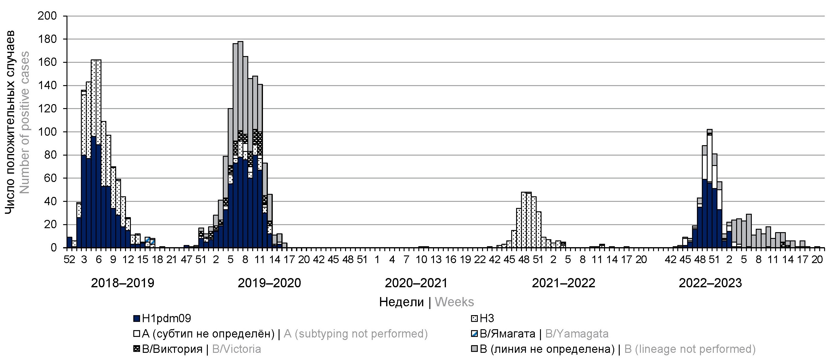 Over a 5-year period, all 18,458 patients hospitalized in infectious diseases hospitals in 3 major Russian cities (St. Petersburg, Novosibirsk, and Yekaterinburg) were examined by PCR to determine the role of influenza viruses A(H1N1)pdm09, A(H3N2), Victoria and Yamagata B lineages, SARS-CoV-2, as well as other pathogens such as RSV, rhinoviruses, metapneumoviruses, coronaviruses, adenoviruses, parainfluenza viruses, bocaviruses, in the development of SARI requiring hospitalization, and to determine age-specific etiology of disease. Weekly monitoring of influenza cases among the examined patients showed an alternation of dominant pathogens: A(H1N1)pdm09 and A(H3N2) in the 2018–2019 season, A(H1N1)pdm09 and B in the 2019–2020 season, A(H3N2) in the 2021–2022 season, A(H1N1)pdm09 and B in the 2022–2023 season. Among influenza B viruses, strains of the Victoria lineage predominated in all seasons. The last cases of influenza B lineage Yamagata in our study among hospitalized patients were reported at the end of 2019–2020 season. In 2020–2021 season (developed SARS-CoV-2 pandemic), there were almost no cases of influenza A and B among the hospitalized patients studied. In the 2022–2023 season, the data obtained on the monitoring of influenza etiology among hospitalized patients clearly correlated with the results of traditional surveillance in Russia [10], while in North America and Western Europe, influenza A(H3N2) viruses were most prevalent [11, 12]. Such differences determine the necessity to formulate its own strategy of strain selection for vaccines in Russia (taking into account WHO recommendations) in order to improve the effectiveness of vaccine prophylaxis, as it is carried out at the national level in other highly developed countries, for example, the National Immunization Advisory Committee Technical Working Group in China [13].