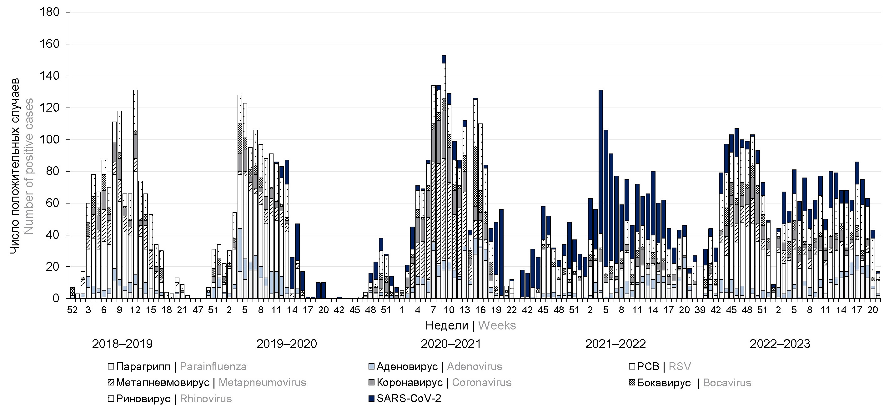 Weekly monitoring showed a change in the etiologic mosaic of SARI pathogens during the COVID-19 pandemic, with a sharp decrease in the detection rate of influenza and RSV viruses and its gradual recovery in the post-pandemic period.