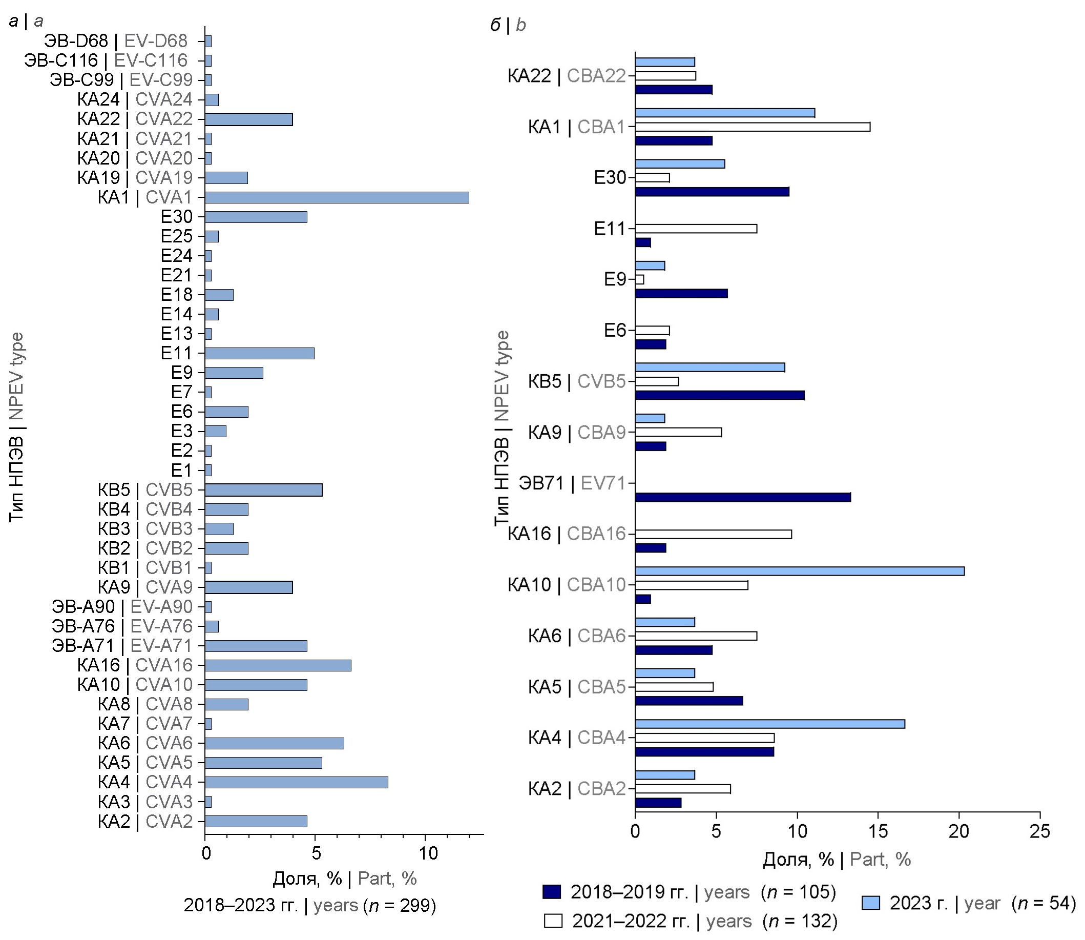 Всего определён 41 тип НПЭВ, выявленных в 2018–2023 гг. На рис. 4, а видно, что ряд типов НПЭВ был установлен в единичном или небольшом числе случаев (n = 64: КА3, КА7, КА8, ЭВ-А76, ЭВ-А90, КВ1, КВ2, КВ3, КВ4, Е1, Е2, Е3, Е6, Е7, Е13, Е14, Е18, Е21, Е24, Е25, КА19, КА20, КА21, КА24, ЭВ-С99, ЭВ-С116, ЭВ-D68), другие типы обнаруживались относительно часто (n = 135: КА2, КА5, КА10, ЭВА71, КА9, КВ5, Е9, Е11, Е30, КА22), 4 вируса являлись превалирующими (n = 100: КА4, КА6, КА16, КА1). Выявленные вирусы относились к 4 видам: Enterovirus A (44,5%; 133/299), Enterovirus B (35,1%; 105/299); Enterovirus С (20,1%; 60/299); Enterovirus D (0,3%; 1/299). Среди НПЭВ вида Enterovirus A идентифицированы 12 типов, при этом чаще обнаруживались вирусы КА4 (18,8%; 25/133), КА6 (14,3%; 19/133) и КА16 (15%; 20/133). Вид Enterovirus B включал 20 типов НПЭВ, доминирующее положение среди которых занимали вирусы КА9 (11,4%; 12/105), КВ5 (15,2%; 16/105), Е11 (14,3%; 15/105) и Е30 (13,3%; 14/105). Идентифицированы 8 типов НПЭВ вида Enterovirus С, где наиболее часто выявлялся вирус КА1 (60%; 36/60). В 1 случае в фекалиях обнаружена РНК вируса ЭВ-D68.