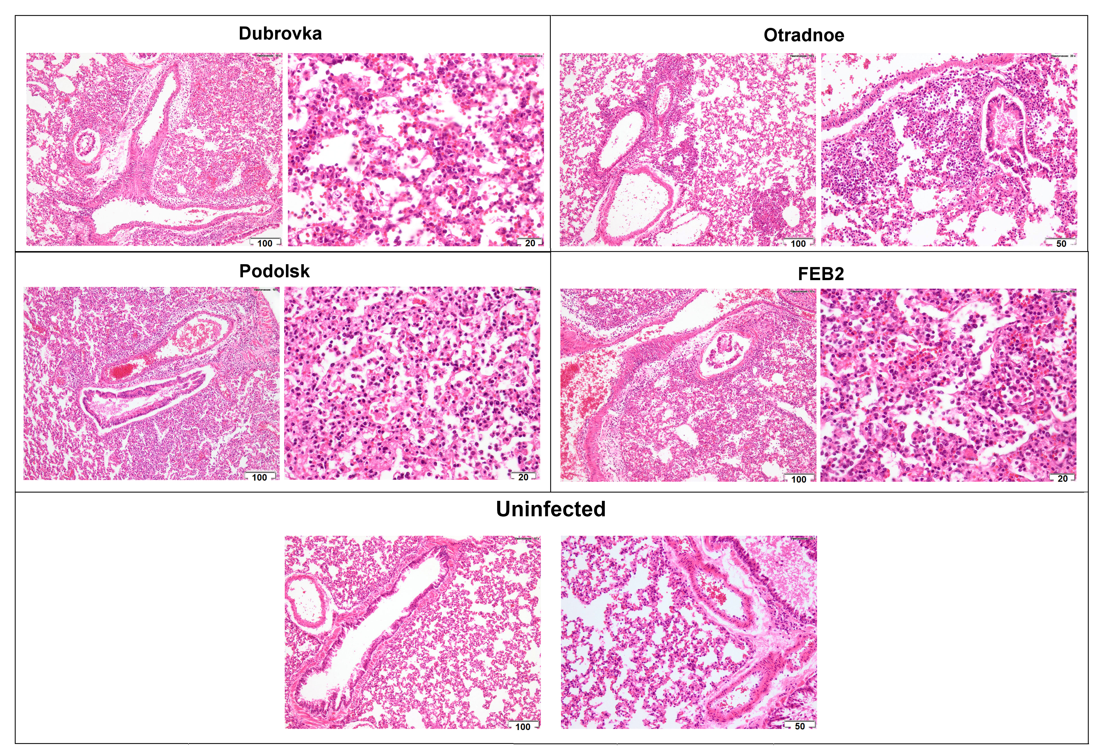 On the 4th day after infection, the groups of animals infected with Wuhan-like Dubrovka strain and FEB2 strain (BA 5.2) showed similar in nature and severity inflammatory changes, the morphological picture of which corresponded to bronchointerstitial pneumonia in the viral stage. The lumen of bronchi and bronchioles in the foci of pneumonia often contained cellular debris, macrophages and neutrophils. The integrity of epithelial lining was focally disturbed due to migration of lymphoid cells, dystrophy, necrosis and desquamation of epitheliocytes. There were loci of epithelial hyperplasia. The wall of bronchi and bronchioles was moderately infiltrated with lymphocytes, histiocytes with a small admixture of polymorphonuclear lymphocytes. Dilated lymphatic vessels located along the course of the bronchial tree contained clusters of lymphocytes. Large lymphoid accumulations (hyperplasia of bronchoassociated lymphoid tissue) were found in the bronchial bifurcation zones. Inflammatory changes were also observed in the walls of medium and small branches of the pulmonary artery accompanying the airways. Perivascular lymphoid tissue was in a state of sharp hyperplasia.