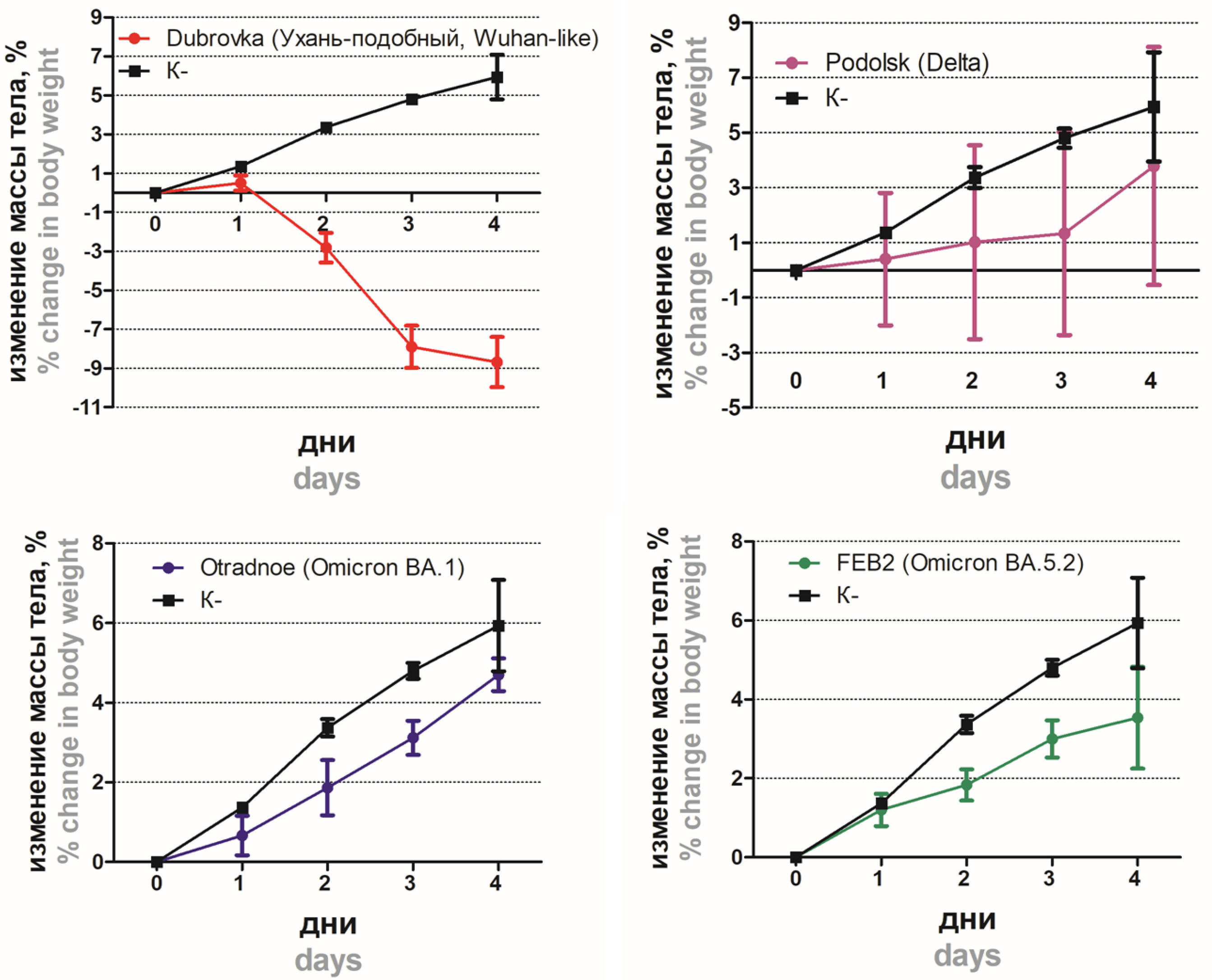 Fig. 4. Weight dynamics in hamsters infected intranasally with different SARS-CoV-2 strains. K– — uninfected hamsters.