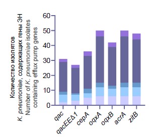 Заключение. Высокая распространённость генов эффлюксных насосов, ассоциированных с устойчивостью к четвертичным соединениям аммония, хлоргексидину и солям цинка, и их значимая связь с антибиотикорезистентностью у нозокомиальных K. pneumoniae подчёркивают важность дальнейшего изучения механизмов кросс-резистентности к биоцидам для совершенствования методов борьбы с патогенами с МЛУ.