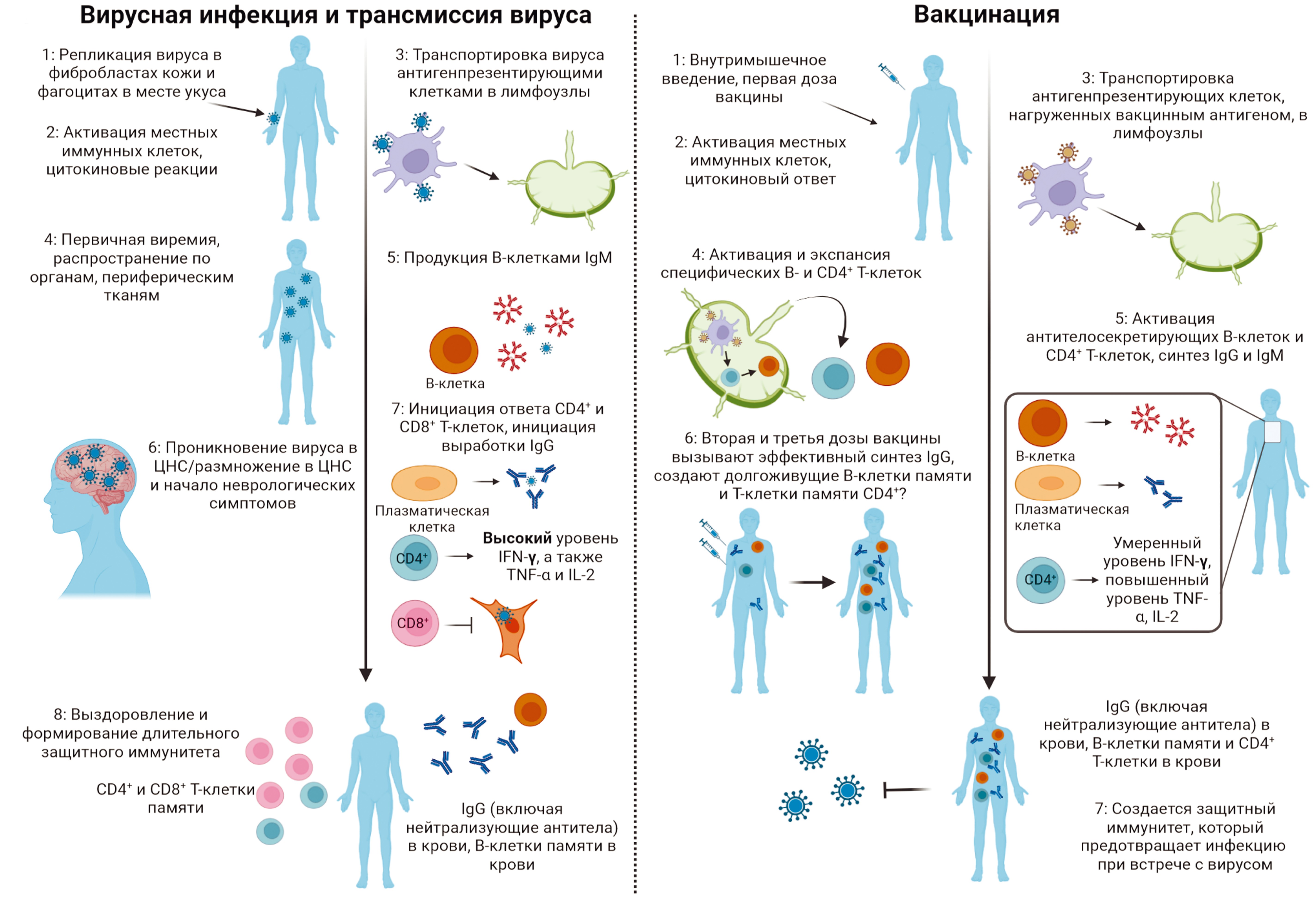 Адаптивный иммунный ответ составляют специфические для вируса КЭ гуморальный (опосредованный антителами) и клеточный иммунные ответы. На рисунке схематически представлены иммунные реакции адаптивного иммунного ответа, возникающие после вакцинации либо при заражении вирусом КЭ.