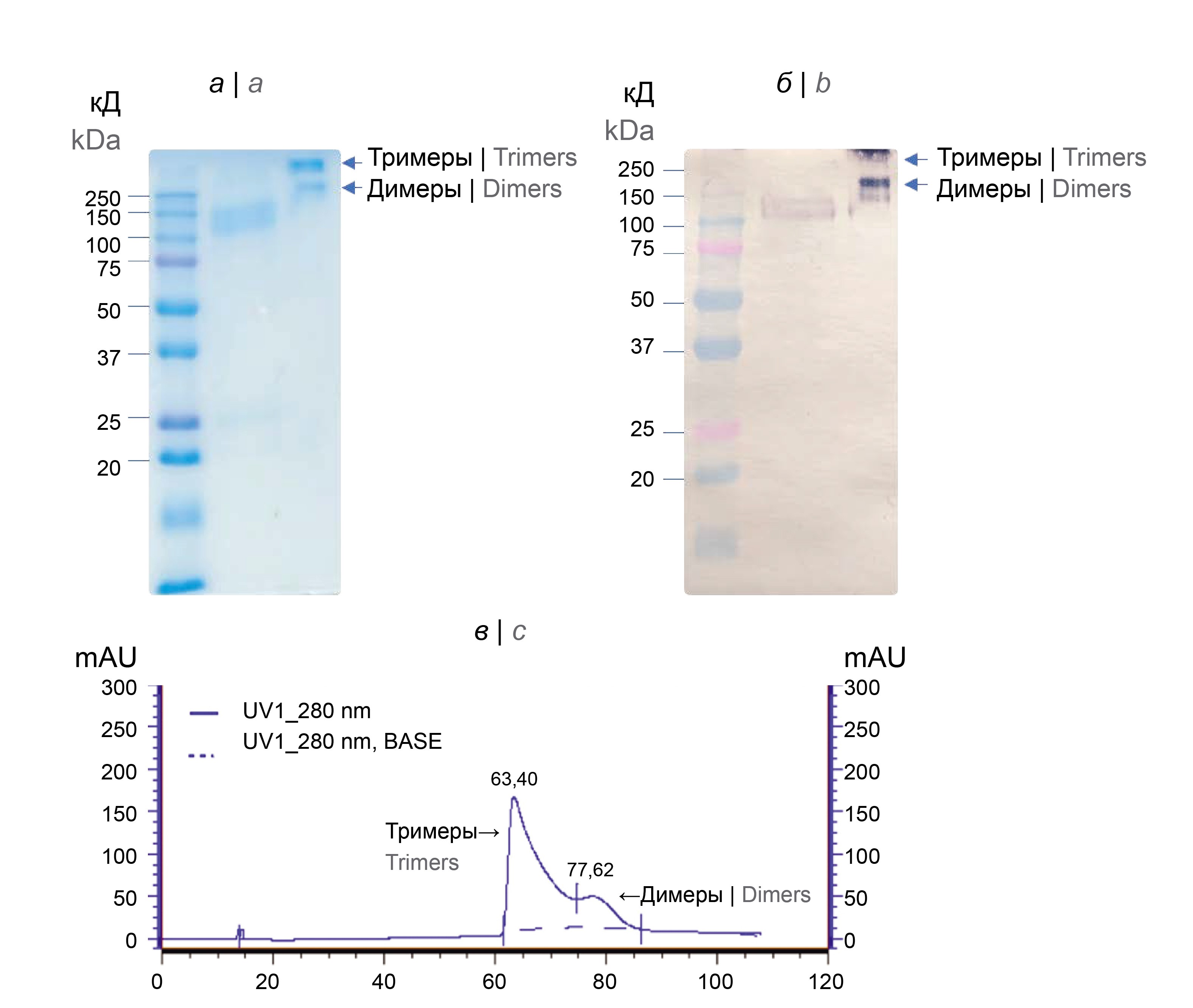 Using gel filtration on a pre-calibrated ChromLinXTM 16/1000 Tiderose GF200 column (Taidu Biotech), it was found that the main peak of the target protein comes out in the region corresponding to the trimeric form (Fig. 4, c).