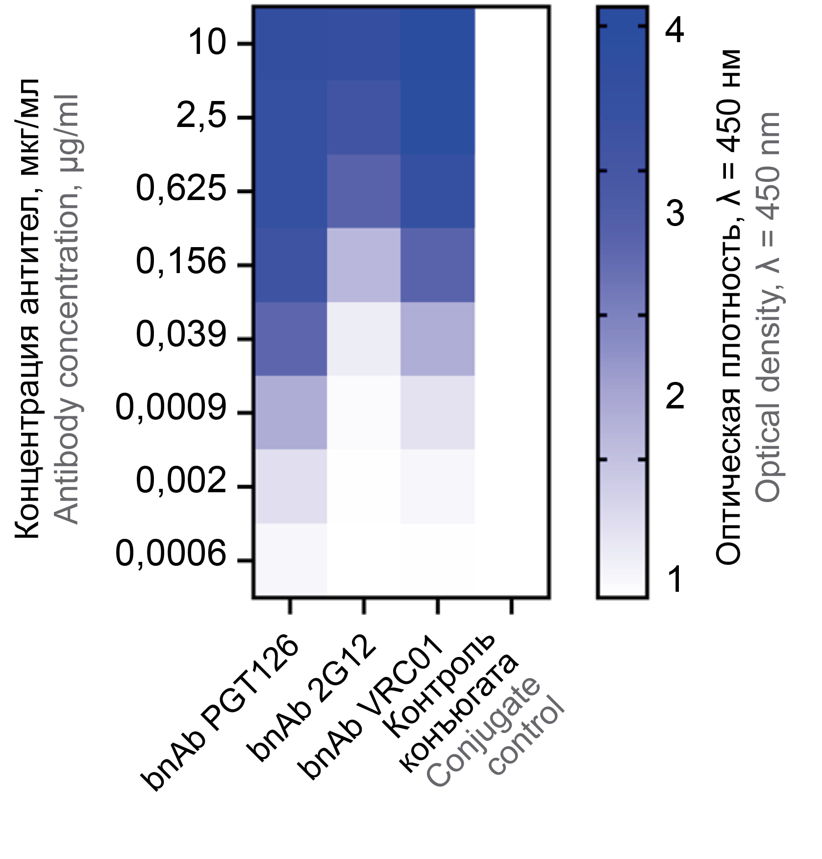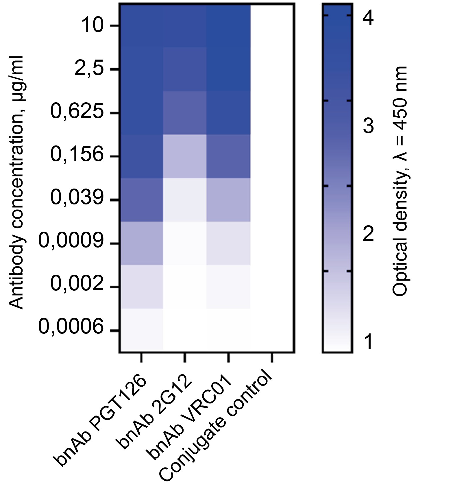 Enzyme immunoassay was performed according to standard methods. The primary antibodies used were bnAbs PGT126, 2G12, VRC01, and secondary antibodies were horseradish peroxidase-labeled goat anti-human IgG antibodies (Sigma). Tetramethylbenzidine solution (Imtek) was used as a chromogenic substrate. The reaction was stopped with 1 N hydrochloric acid solution. The optical density was measured on a Varioskan LUX instrument (Thermo Scientific) at a wavelength of 450 nm.