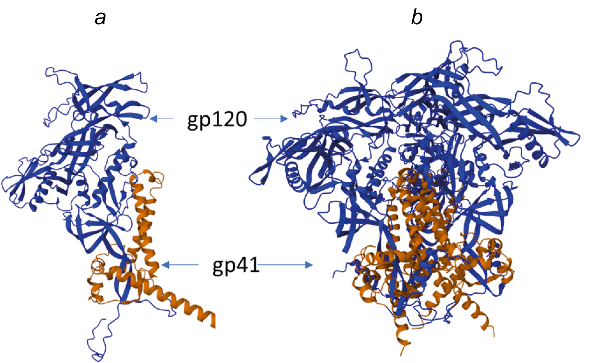 Fig. 2. Structure model of the monomer (а) and trimer (b) of gp140.SOSIP.664.opt.