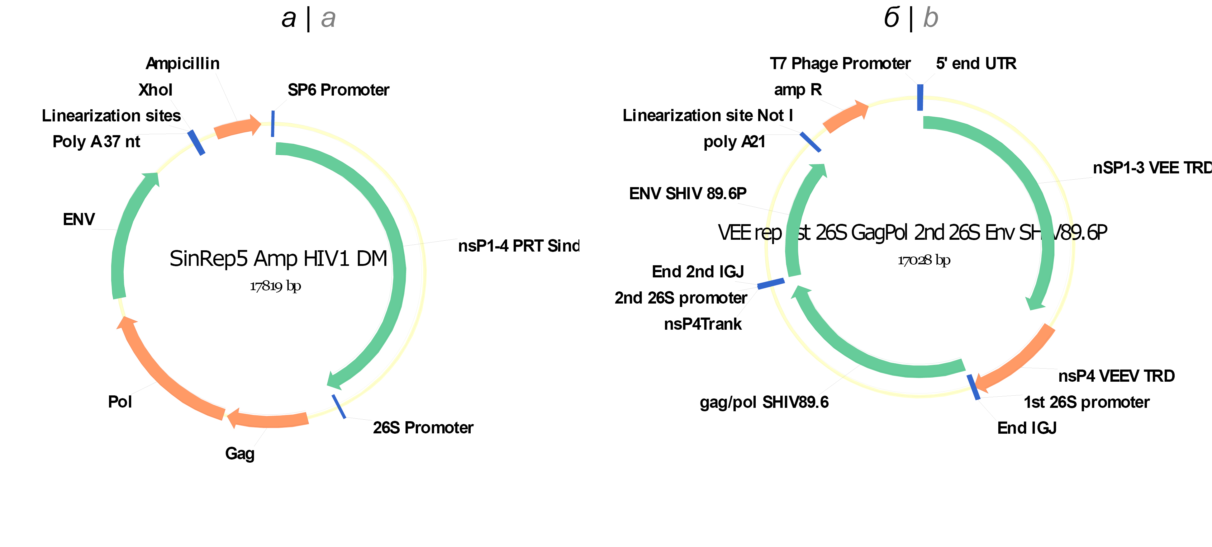 На платформе репликона альфавирусов сконструированы плазмиды, содержащие гены, кодирующие белки Gag и Env ВИЧ (репликон вируса Синдбис) и белки Gаg и Env рекомбинанта SIV и ВИЧ-1B SHIV89.6P (репликон VEEV).