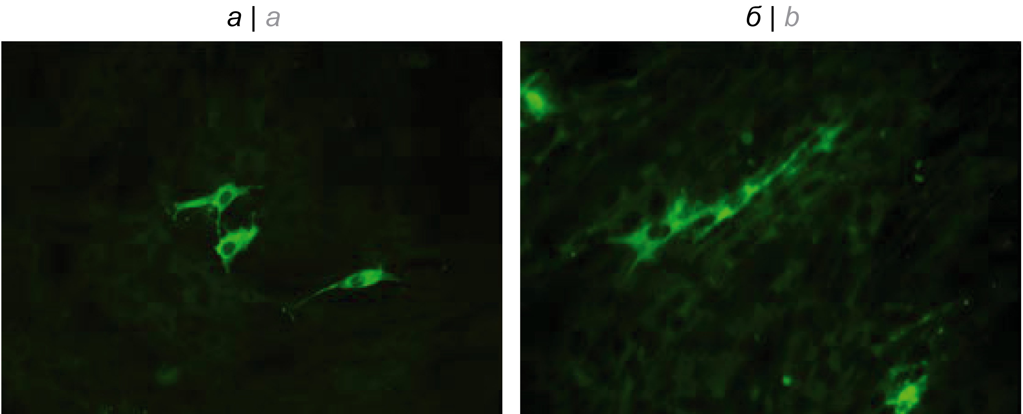 При микроиммунофлуоресцентном анализе структурные белки SHIV89.6P выявлены только в цитоплазме трансфицированных клеток (рис. 3). Титры рекВПЧ составляли 104–106 инфекционных единиц на 1 мл.