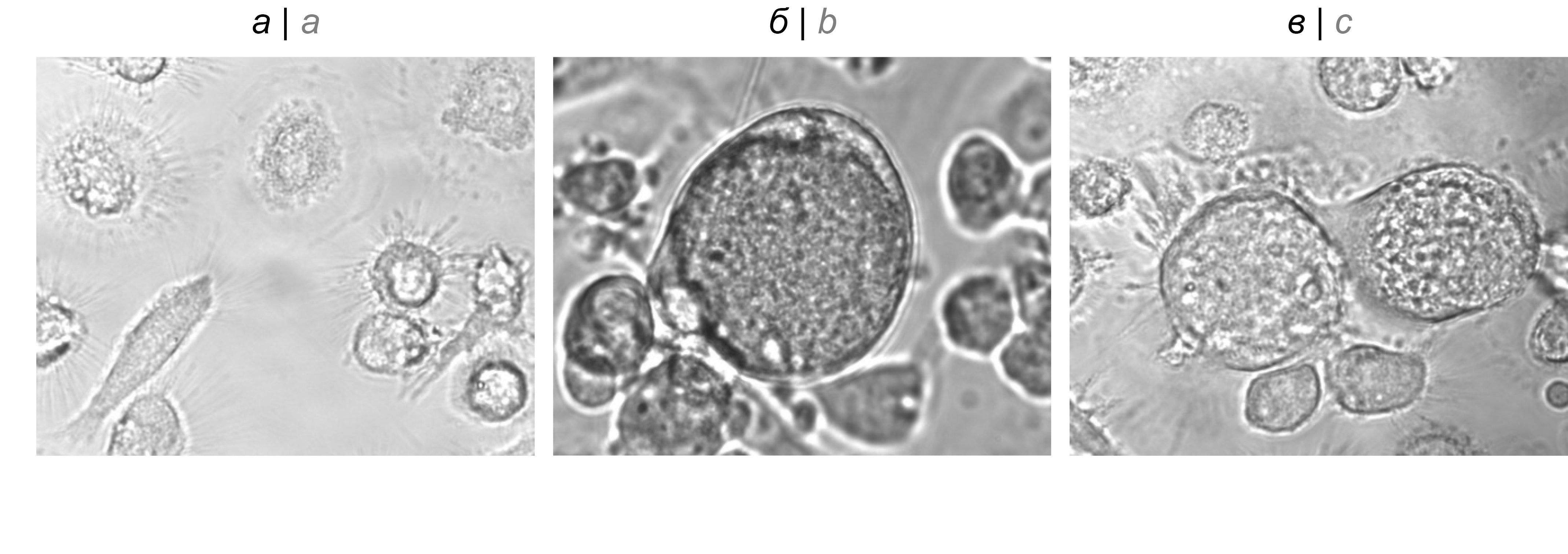 а — негативный контроль, ×20; б, в — сформированный синцитий, ×40: рекВПЧ ВИЧ-1В (б) и рекВПЧ SHIV89.6P (в).