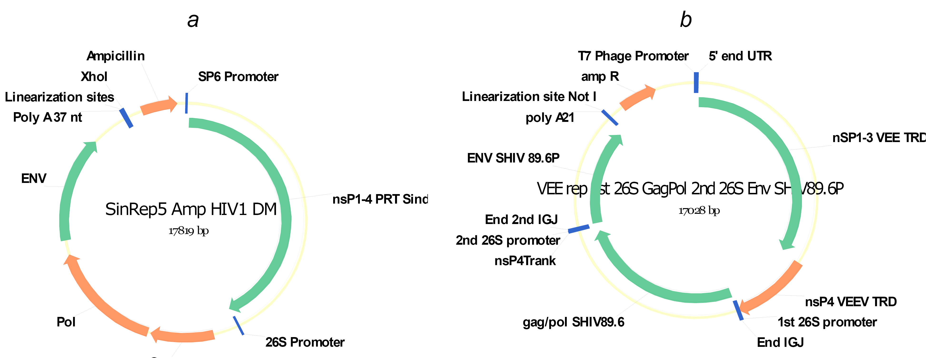 a — on the Sindbis virus replicon platform; b — on the VEEV replicon platform.