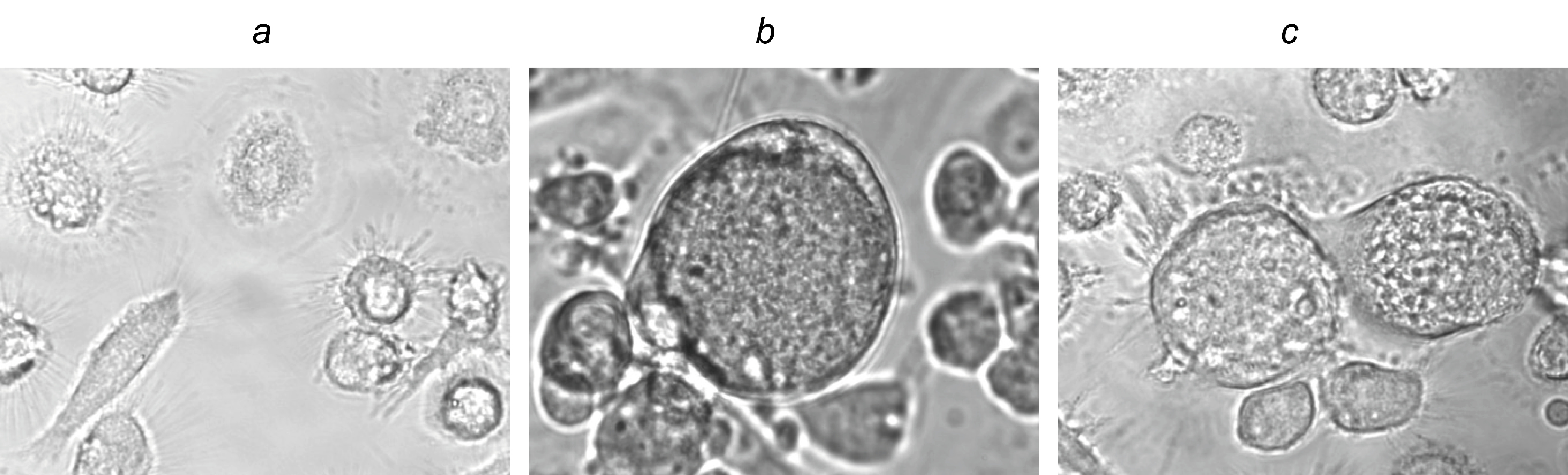 a — negative control, ×20; b, c — formed syncytium, ×40: HIV-1B recVLPs (b) and SHIV89.6P recVLPs (c).