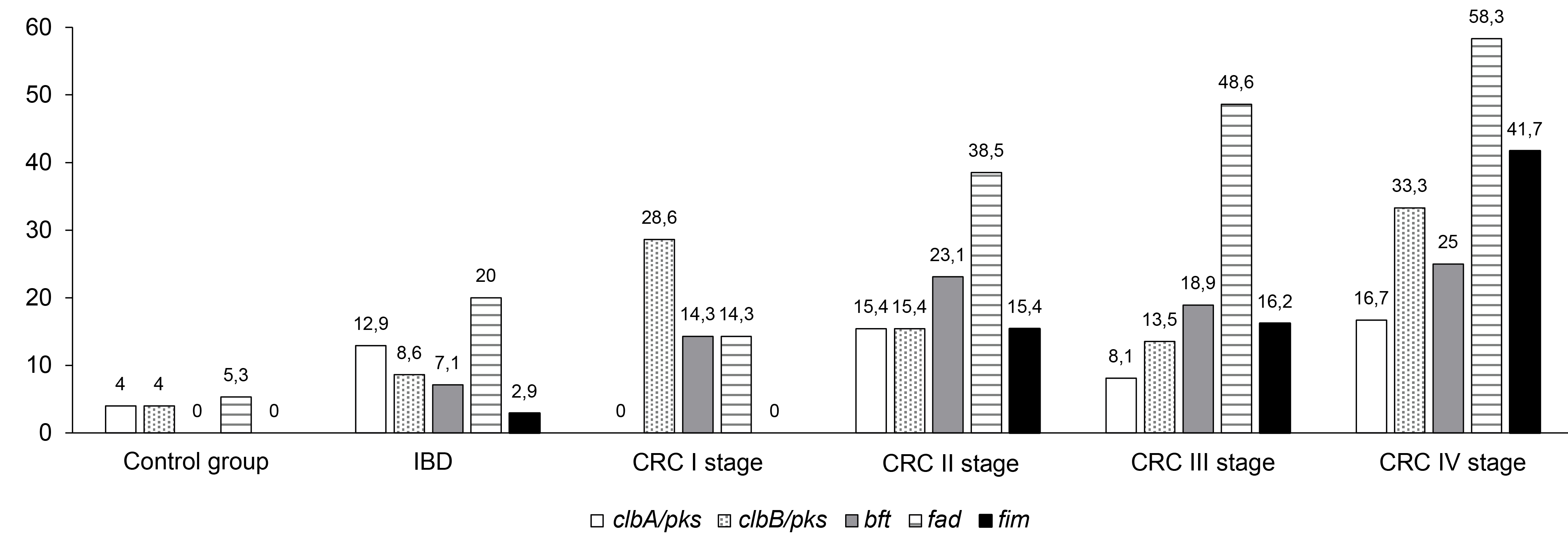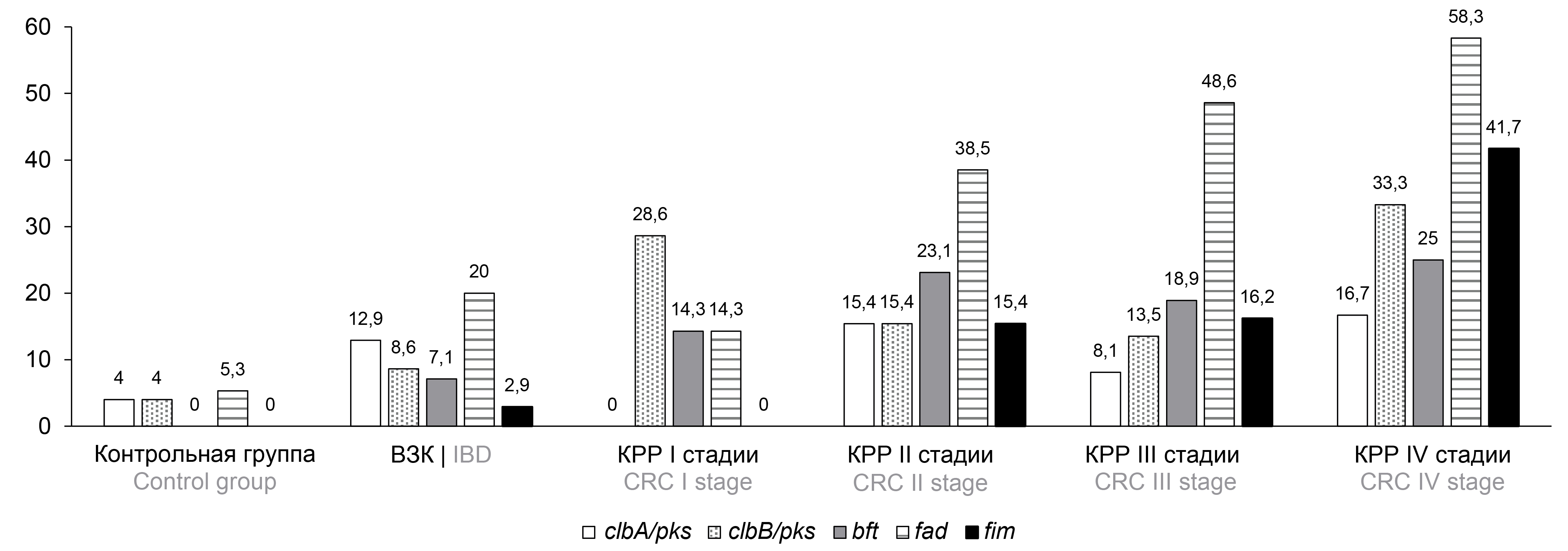 Исследование образцов клинического материала методом ПЦР позволило определить частоты обнаружения генетических маркеров потенциально онкогенных МО у пациентов с КРР на различных стадиях заболевания и в группах сравнения (рисунок). У пациентов с КРР выявлена более высокая распространённость потенциально онкогенных маркеров по сравнению с пациентами с ВЗК и участниками контрольной группы. Прослеживается прямая связь между стадией онкологического заболевания и распространённостью потенциально онкогенных маркеров, в частности ДНК F. nucleatum, а также обращает на себя внимание более высокая частота обнаружения пародонтопатогенных МО на поздних стадиях онкологического процесса. На ранних стадиях опухоли превалируют колибактин-продуцирующие бактерии, несущие ген clbB острова патогенности pks.