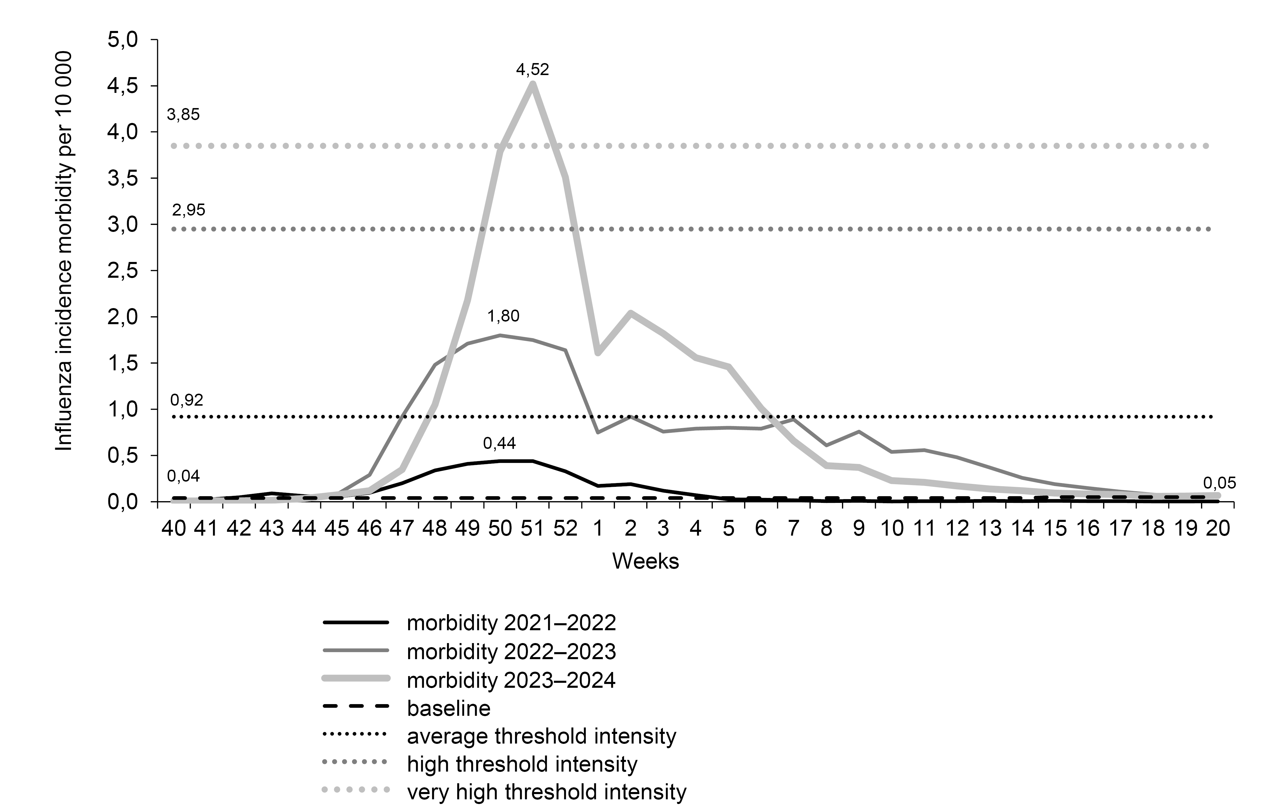 In the 2023–2024 influenza season, influenza incidence exceeded the baseline in week 45 simultaneously in all age groups. Peak incidence was recorded in week 51 simultaneously in pediatric age groups and among persons over 15 years of age. The intensity of influenza incidence at the peak of the epidemic exceeded the very high intensity threshold in all age groups except children 0–2 years of age, in whom it was high. From week 52 onwards, incidence began to decline in all age groups, but remained above post-epidemic baseline in children 0–2 and 3–6 years of age until week 15 (inclusive), and among children 7–14 years of age and persons 15+ years of age until week 18.