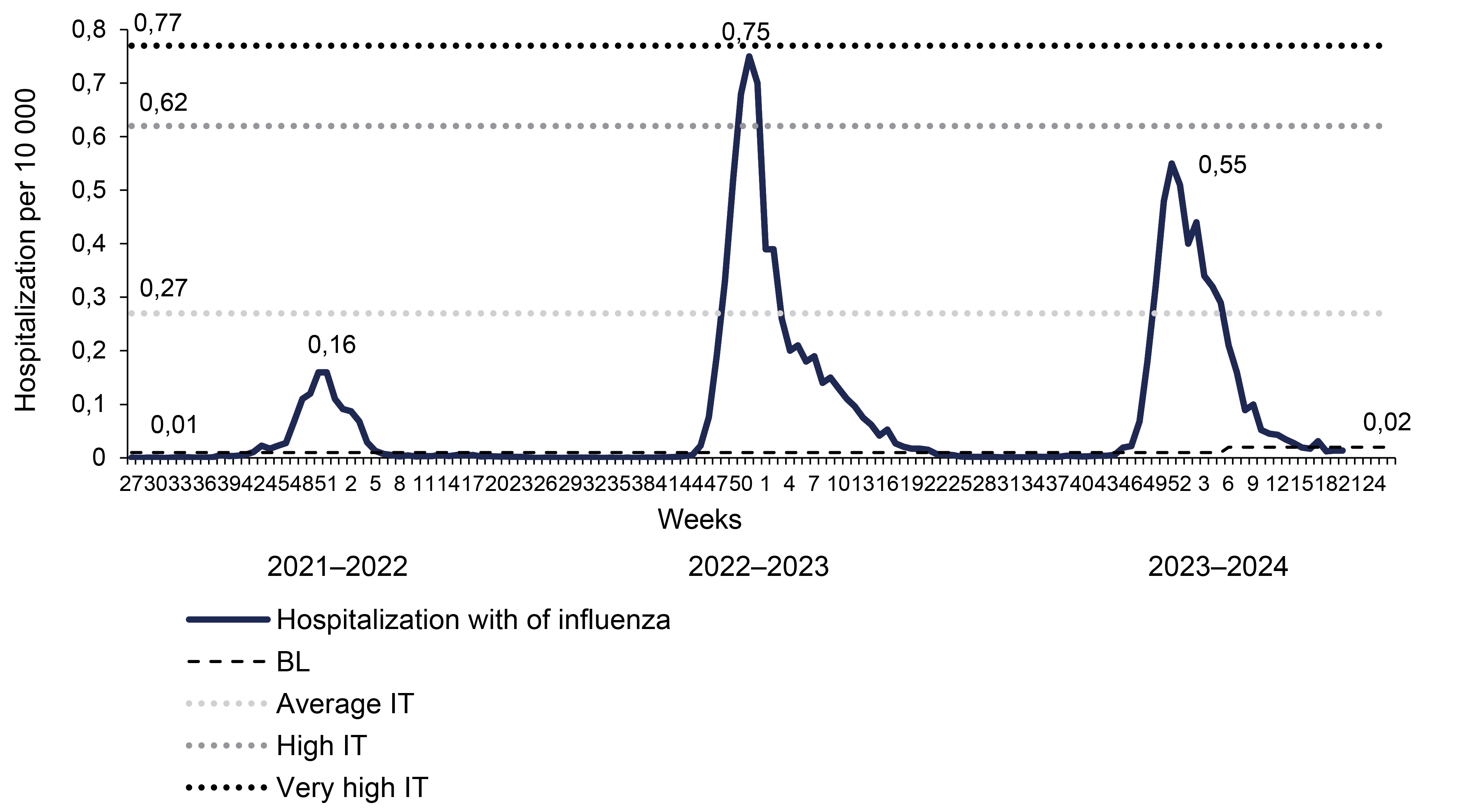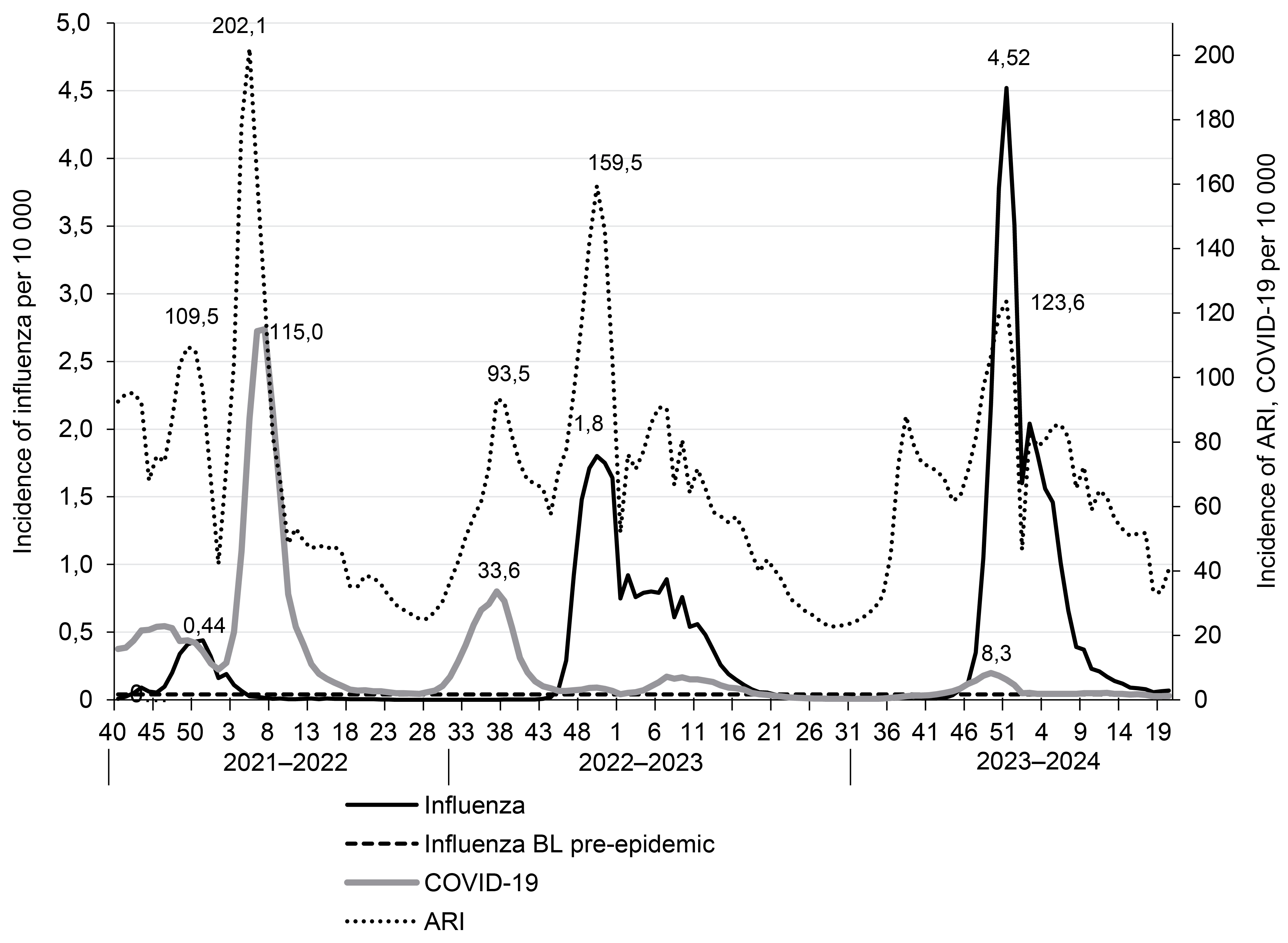 Conclusion. Against the backdrop of the COVID-19 pandemic during the 2020–2021 season, there was no influenza epidemic. In 2021–2022, the A(H3N2) epidemic was of low intensity in terms of incidence, hospitalization rates and low mortality (2 cases). In 2022–2023, the influenza A(H1N1)pdm09 and B epidemic was of moderate intensity in terms of incidence, with a high frequency of hospitalizations and mortality (120 cases). Influenza A(H3N2) and B epidemic in 2023–2024 was of a “very high” level in terms of the influenza incidence, but average in terms of the frequency of hospitalizations and mortality (41 cases), with higher incidence rate compared to the previous epidemic (0.28% and 0.19% of the total population), including persons over 15 years of age (0.19% and 0.12%).