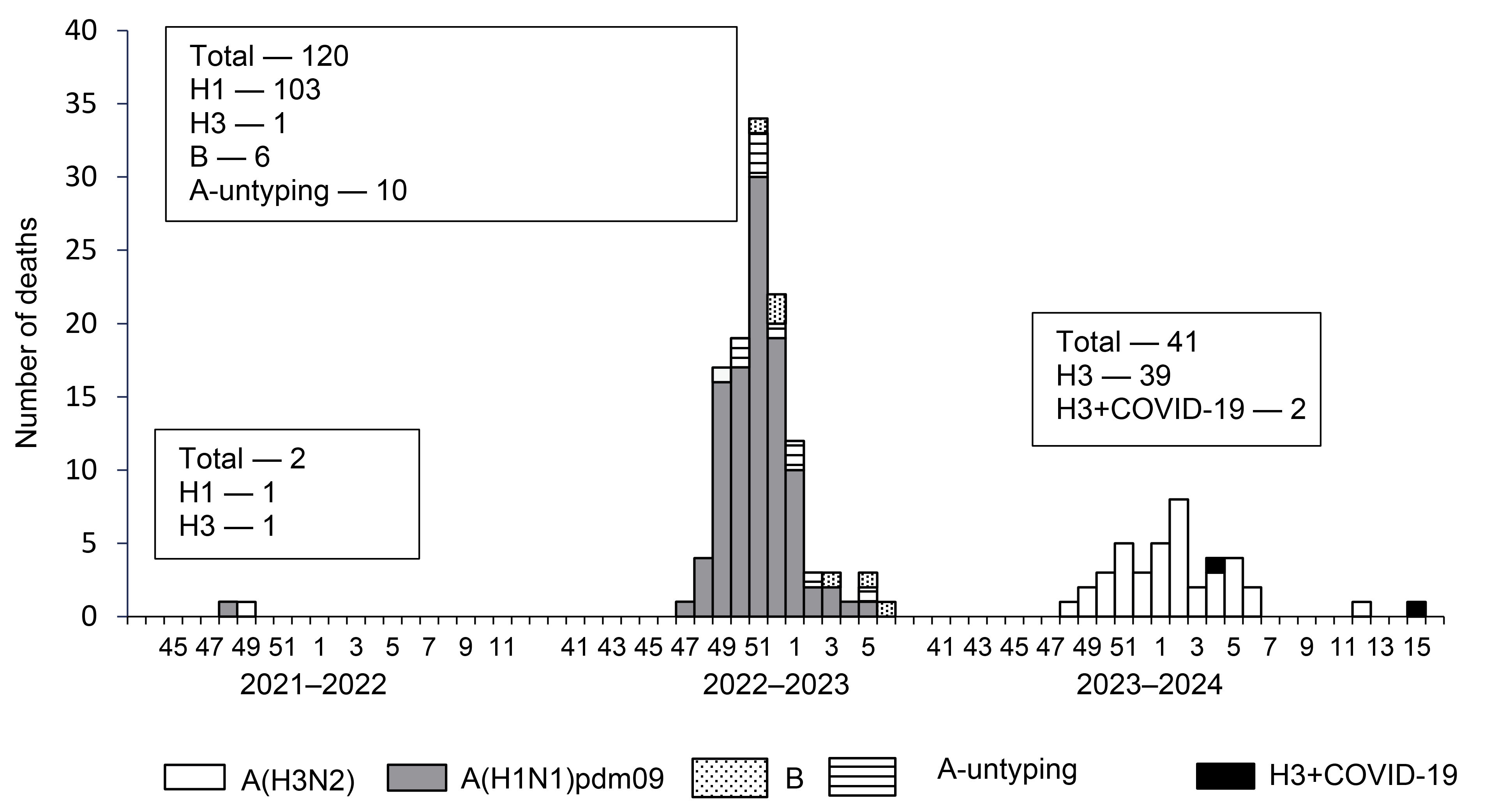 In the 2023-2024 season, 41 deaths from laboratory-confirmed influenza were reported: 39 cases of influenza A(H3N2) and 2 cases of influenza A(H3N2)+COVID-19. This season, deaths were recorded from week 47 of 2023 through week 15 of 2024 (November through April) and only from influenza A(H3N2), i.e., during its circulation period. Deaths from mixed A(H3N2) and COVID-19 infection were reported in January and April. There were no deaths from influenza B, despite its predominant circulation from March to May.