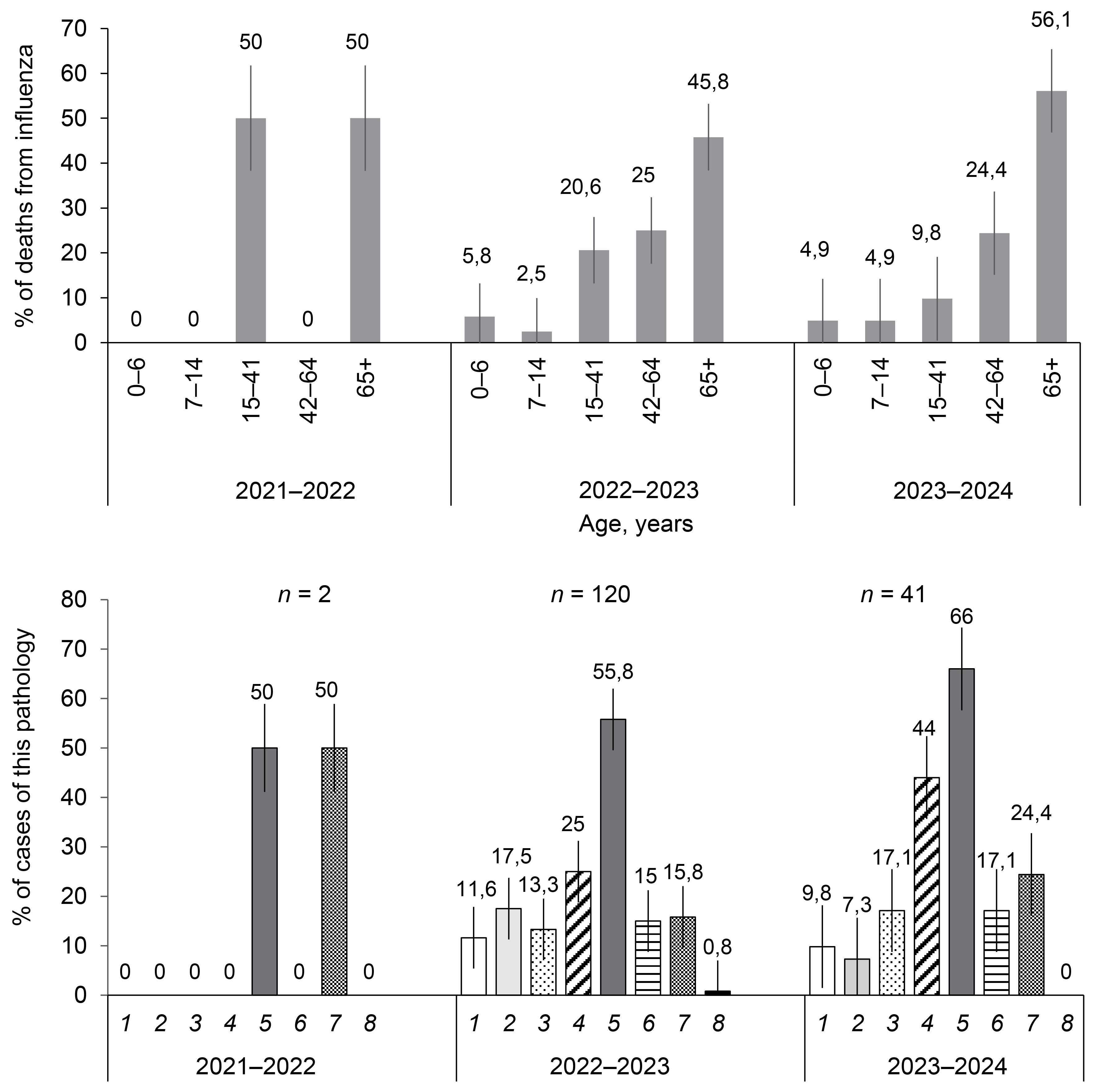 Fig. 6. Age structure and structure of background pathology of those who died from laboratory confirmed influenza during the epidemic in 2021–2024.