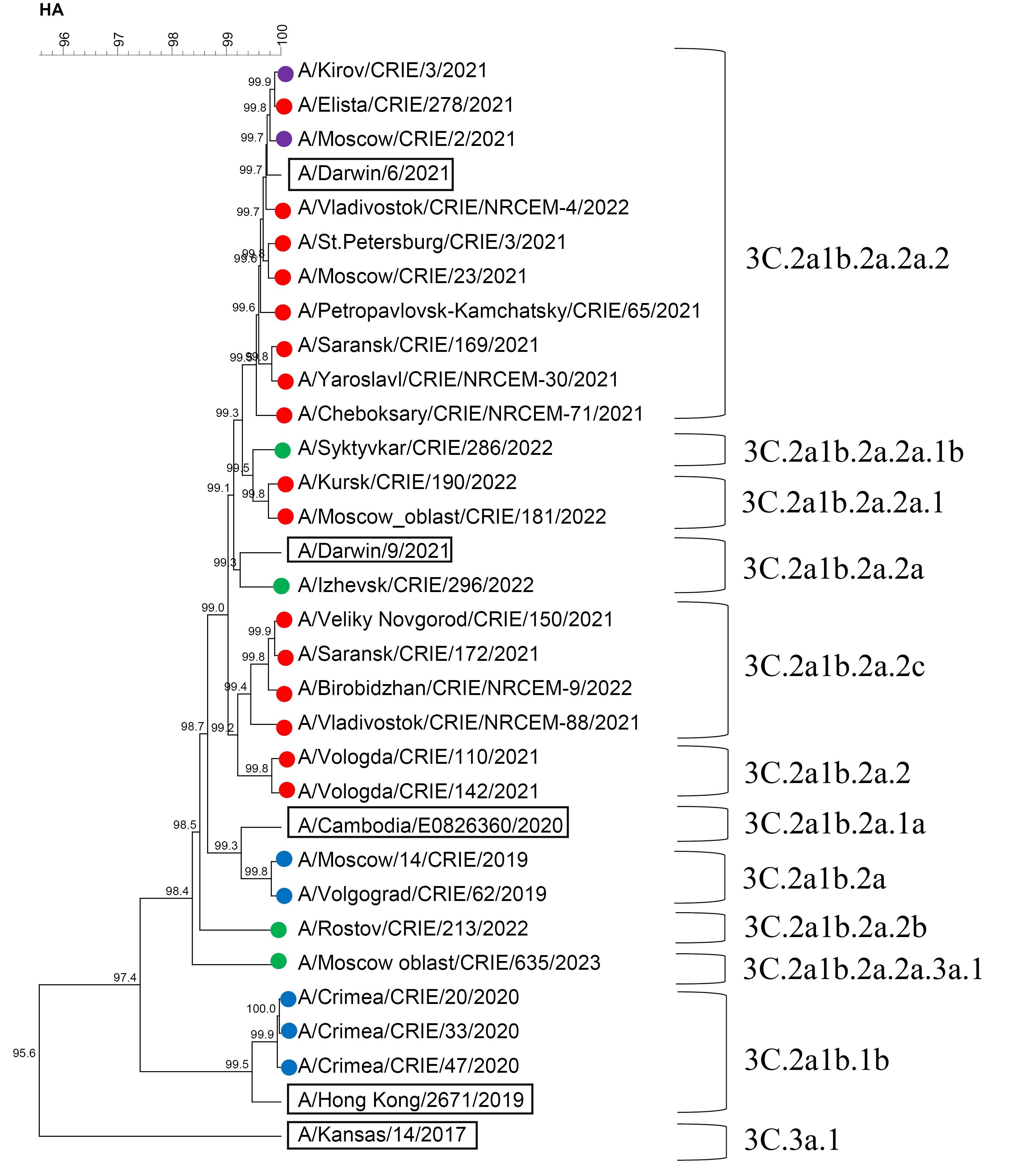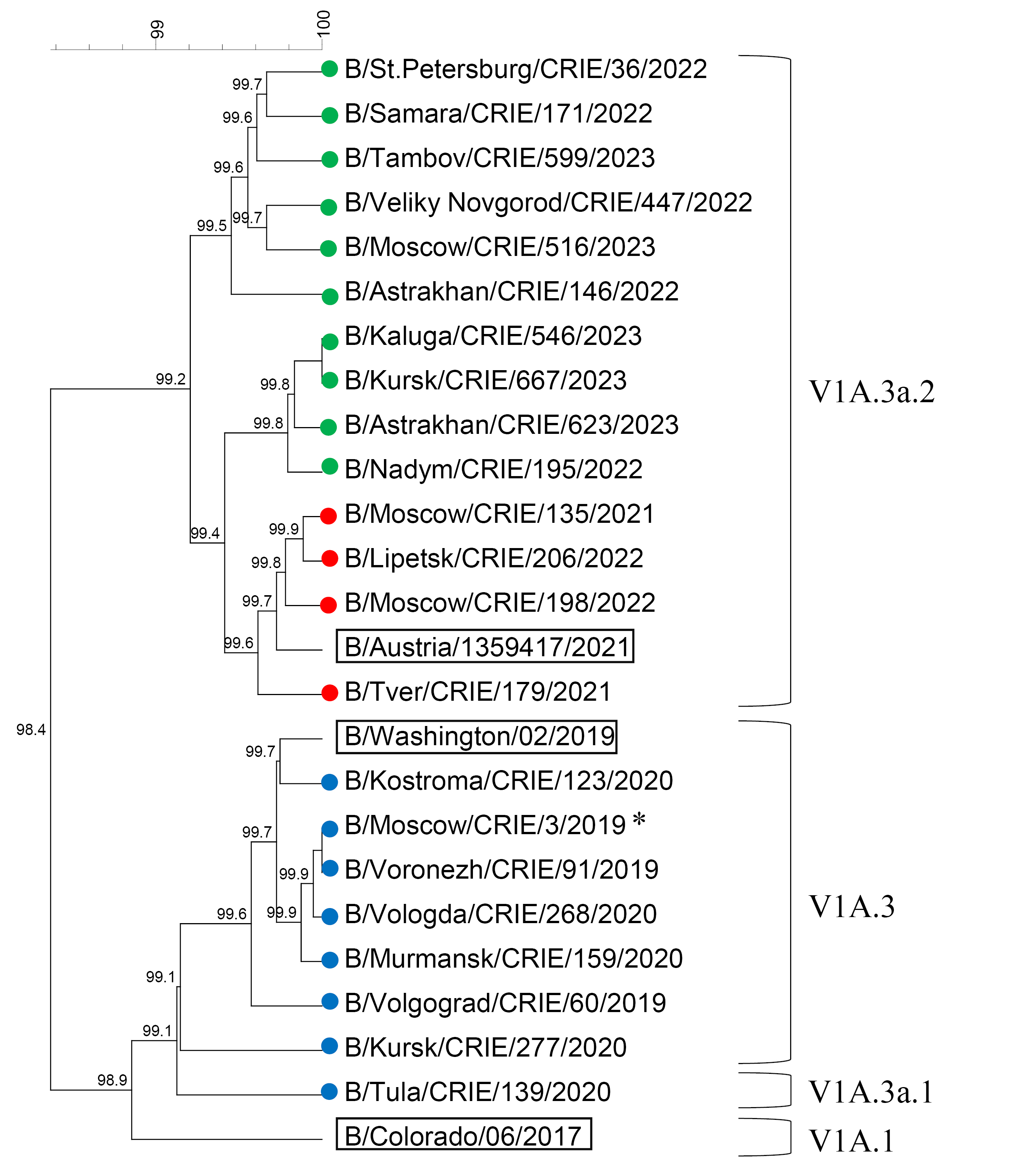 Вакцинные штаммы выделены прямоугольниками. Синими и зелёными кругами обозначены последовательности вирусов, циркулировавших в 2019–2020 и 2022–2023 гг. соответственно. *Летальный случай.
