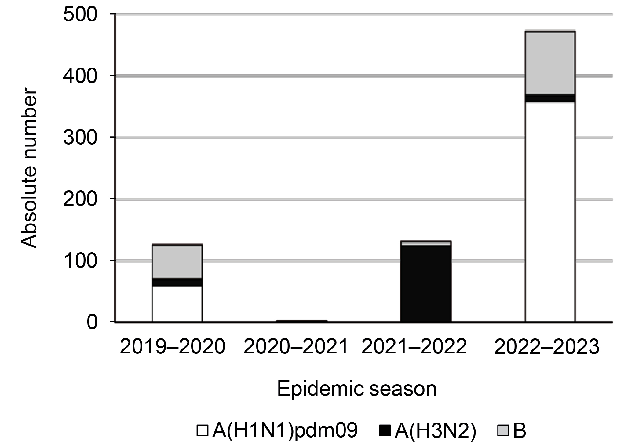 Fig. 1. Number of influenza viruses tested at the Reference center for monitoring upper and lower respiratory tract infections in 2019–2023.