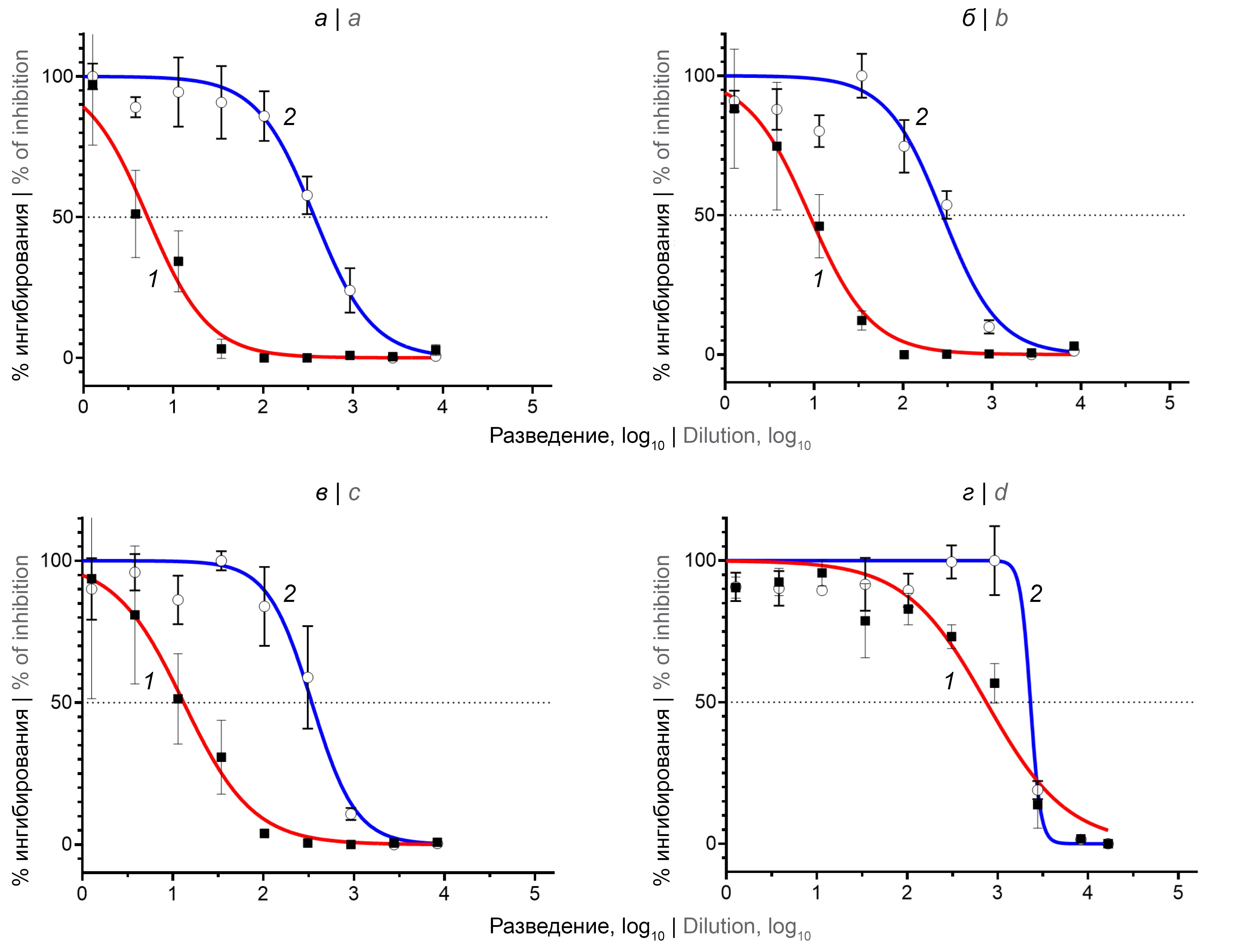 Fig. 3. Neutralizing activity of the FM1 drug (1) and the control drug palivizumab (2) against RSV strains A2 (а), seasonal RSV A (b), RSV B 9320 (c) and seasonal RSV B (d).