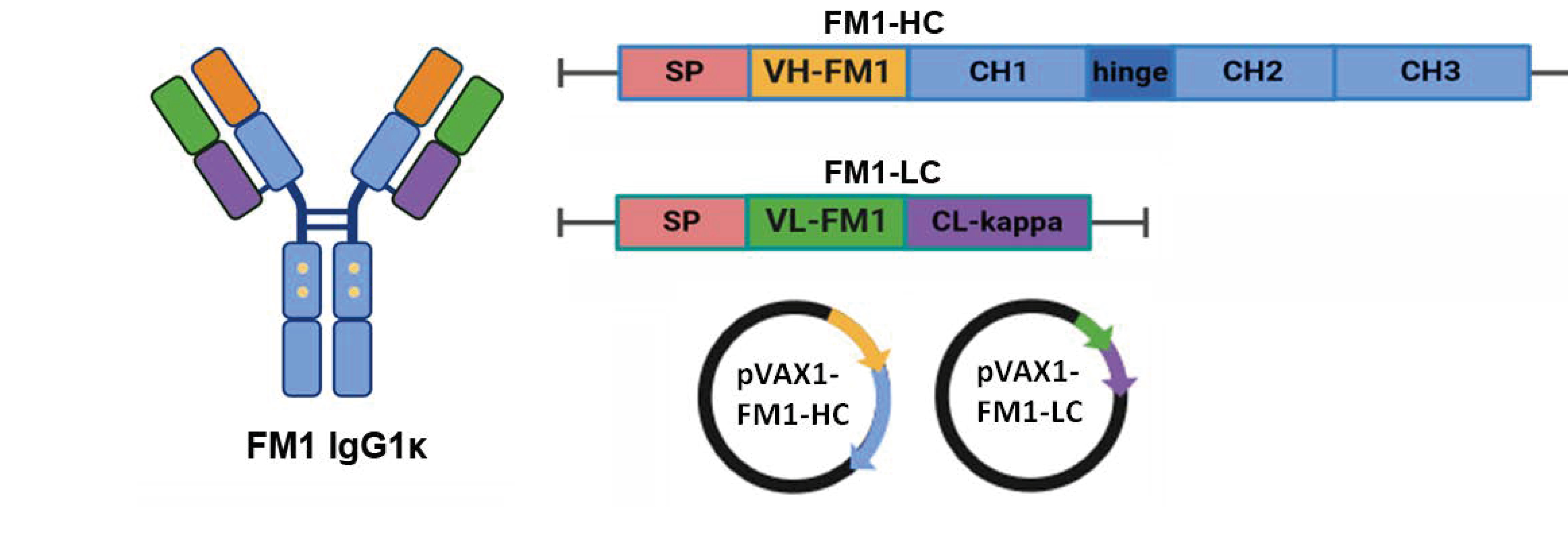 Для высокопроизводительной экспрессии и продукции рМКА FM1 в эукариотических клеточных линиях была выбрана 2-плазмидная система экспрессии на базе вектора pVAX1. Были получены генно-инженерные конструкции для тяжёлой и лёгкой цепей рМКА FM1, содержащие вариабельные и константные области антитела, а также сигнальные пептиды, при котрансляции которых формируется полноразмерное рМКА FM1.