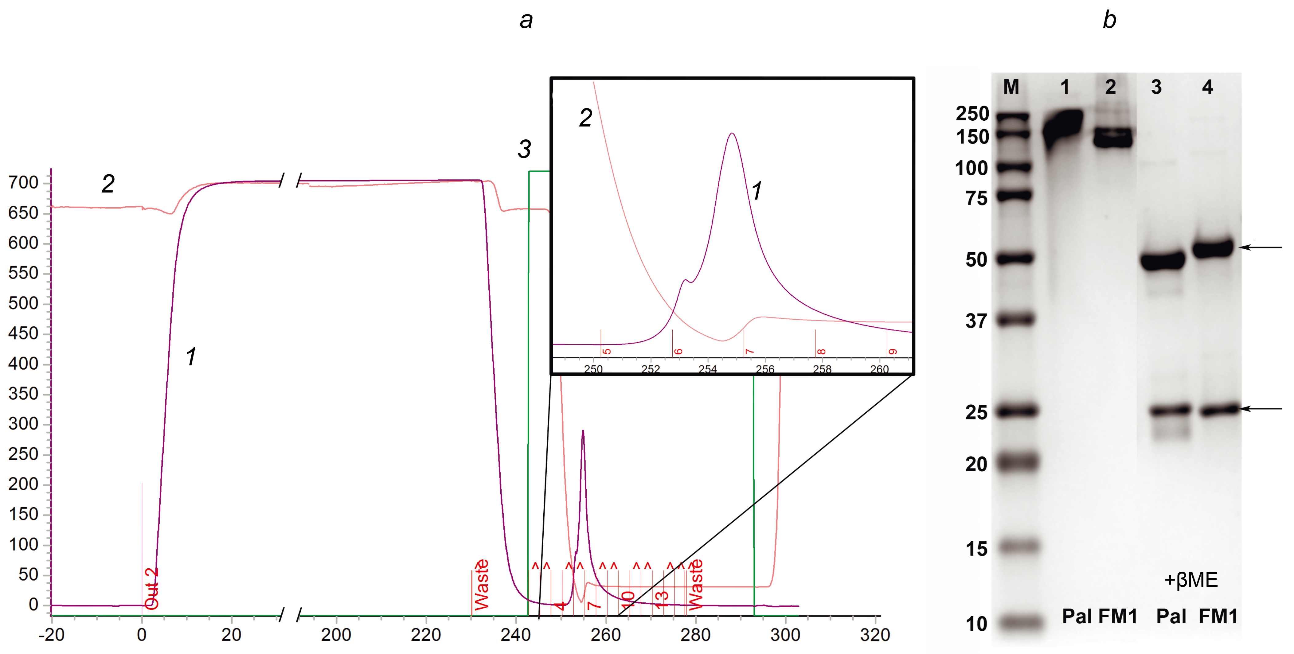 b — the results of the electrophoresis in PAAG of the purified FM1 drug compared with the control drug palivizumab (Pal). The preparations were applied in non-reduced (tracks 1 and 2) and reduced conditions (tracks 3 and 4; βME — β-mercaptoethanol). M — molecular weight marker (Bio-Rad). On tracks 3 and 4 there are visible zones corresponding to electrophoretic mobility of recombinant antibody heavy (HC) and light (LC) chains. The gel was colored by Coomassie colloidal solution and processing using the Gel Doc EZ Imager (Bio-Rad).
