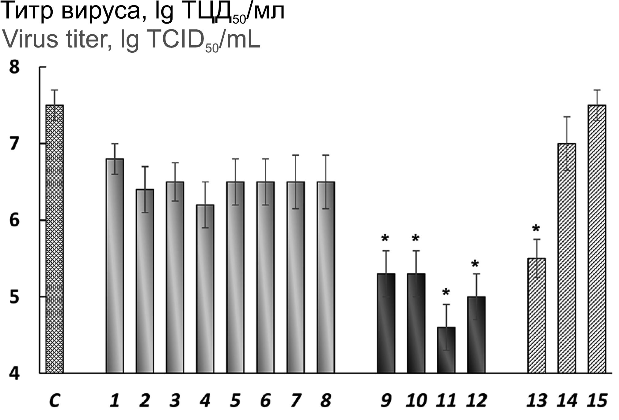С — контроль вируса без образцов. 1–8 — нанокомплексы Si~NH2/RNA, содержащие RNA1–RNA8 (концентрация РНК в нанокомплексах 0,5 мкМ); 9–12 — нанокомплексы Si~NH2/siRNA, содержащие siRNA1/4, siRNA3/4, siRNA5/4 и siRNA7/4 (концентрация siRNA в нанокомплексах 0,5 мкМ в расчёте на одну цепь); 13 — озельтамивир (10 мкг/мл или 32 мкМ); 14 — Si~NH2 (концентрация частиц 0,5 мМ); 15 — Si~NH2/siRNA9/10 (нанокомплекс, содержащий неспецифическую (для вируса гриппа А) siRNA9/10). Множественность заражения — 0,01 ТЦД50/кл. Представленные средние значения, стандартные отклонения и отличия величин титров вируса рассчитаны по методу Спирмена–Кербера. *р ≤ 0,05 по сравнению с контролем.