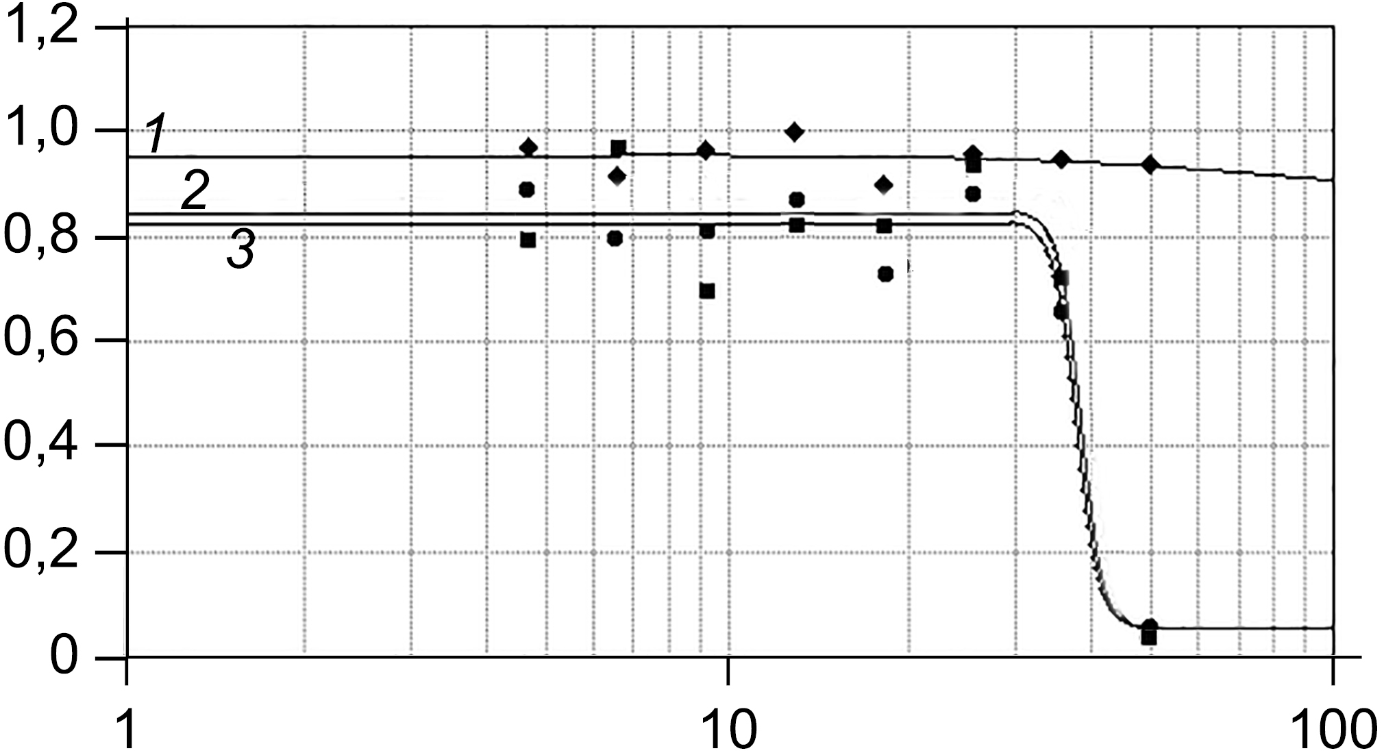 1, siRNA5/4; 2, Si~NH2; 3, Si~NH2/siRNA5/4. The x-axis shows the concentration of siRNA in the free state or as part of a nanocomplex (µM) and Si~NH2 nanoparticles in the free state or as part of a nanocomplex (mM). The y-axis shows optical density of the MTT solution.