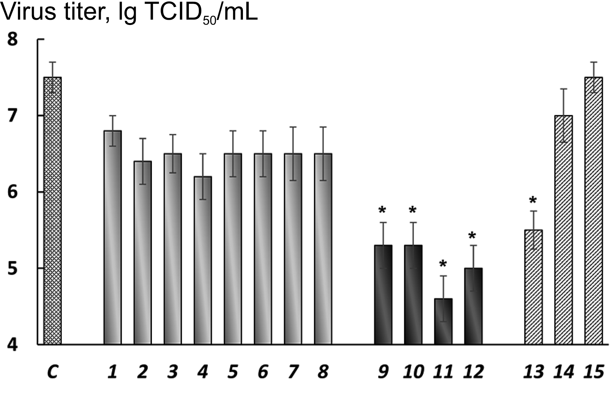 C, virus control without samples. Si~NH2/RNA nanocomplexes containing RNA1–RNA8 (1–8), concentration of RNA in nanocomplexes is 0.5 µM; Si~NH2/siRNA nanocomplexes containing siRNA1/4, siRNA3/4, siRNA5/4 and siRNA7/4 (9–12), concentration of siRNA in nanocomplexes is 0.5 µM per one strand; ozeltamivir (13), 10 µg/mL or 32 µM; Si~NH2 (14), 0.5 mM; Si~NH2/siRNA9/10, nanocomplex containing unspecific siRNA9/10 (15). MOI, 0.01 TCID50/cell. The presented average values, standard deviations and differences in the titer values of the virus are calculated using the Spearman–Kerber method. Asterisks designate the difference between the control and the titer values of the virus obtained under the action of the studied series of nanocomplexes, at p < 0.05.