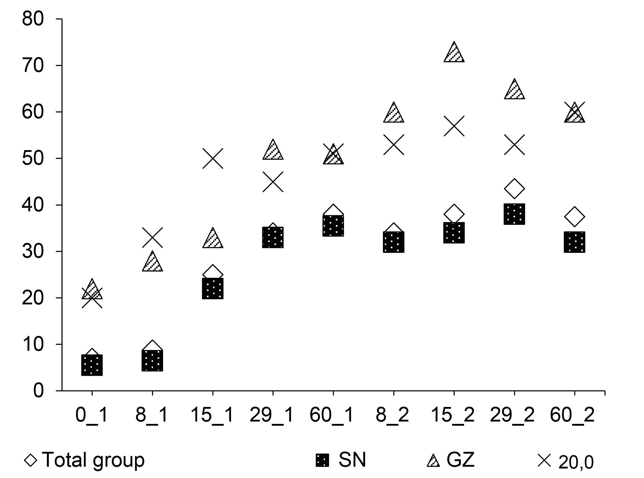 Fig. 3. B. pertussis-specific secretory IgA antibody (median values) dynamics in nasopharyngeal/oropharyngeal aspirates of vaccinated volunteers and additional groups SN, GZ and SP.