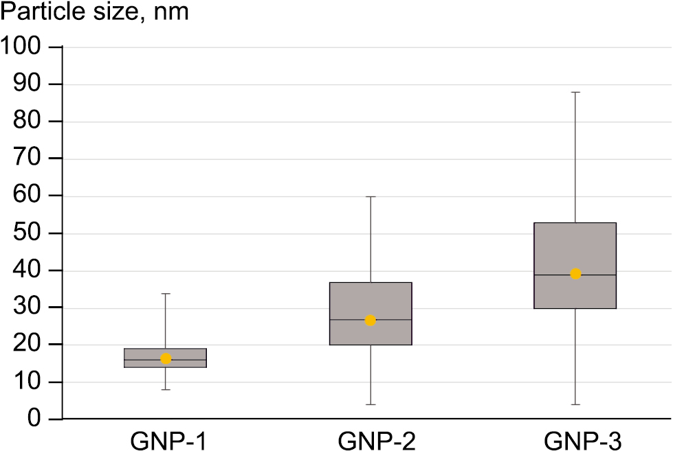 Fig. 3. Size distribution diagrams for GNP-1, GNP-2, and GNP-3 (Box Plot functions).