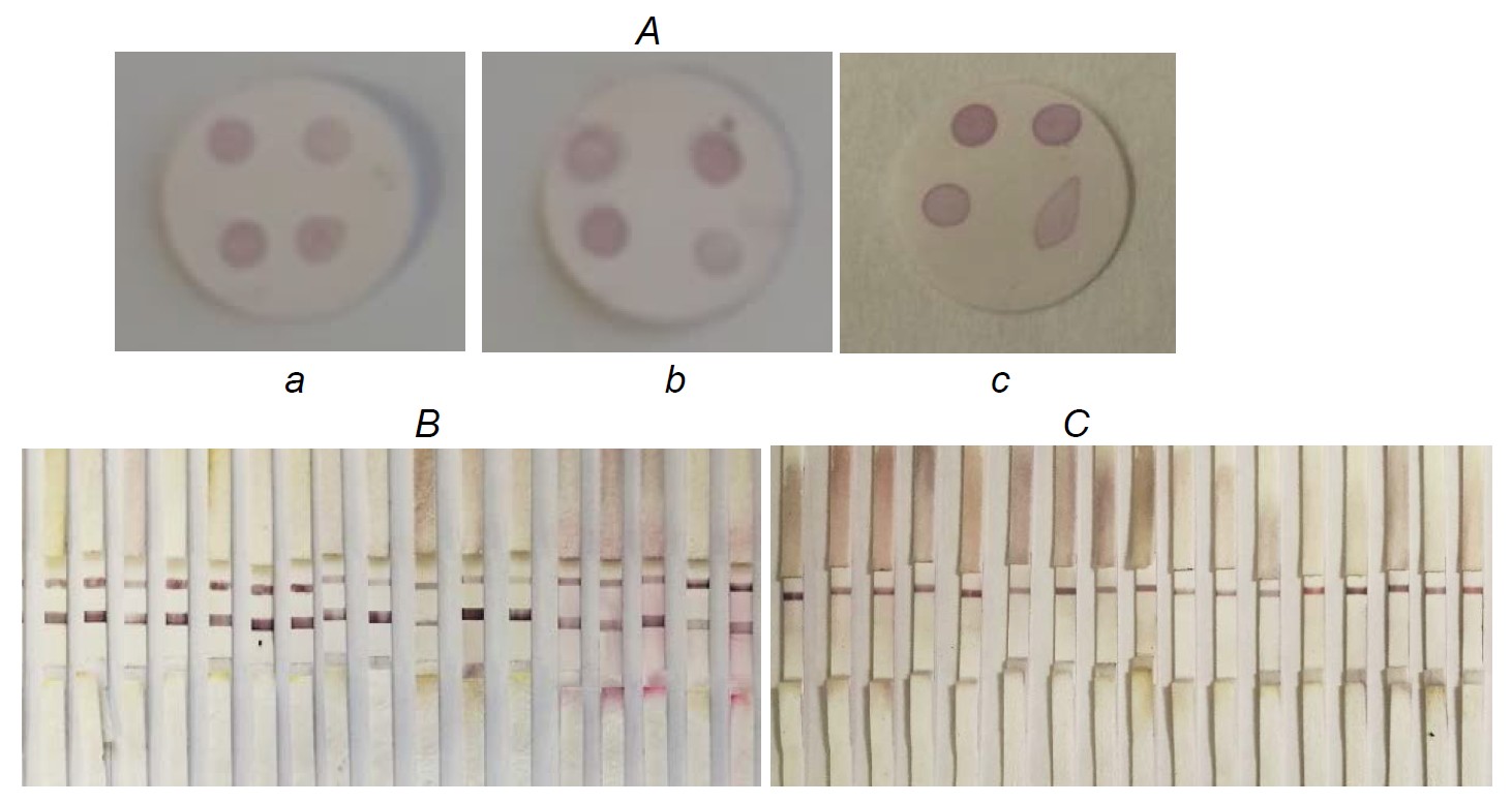 Further, the conditions for formation of control and analytical zones of the test strip have been selected. This included varying parameters such as concentrations of sorbed AB and PAB, the speed of their application and conditions for drying the membranes. Based on the obtained results, a dilution of the conjugate with A520 = 4 was chosen, as it demonstrated sufficiently bright coloring of the test and control bands and there was no background staining of the membrane in reactions with blood serum samples. Increasing the AB concentration in the analytical zone (0.25, 0.5, 1 mg/mL) and PAB concentration in the control zone (0.5, 1, 2 mg/mL) resulted in an increase of staining intensity. At AB concentration of 0.5 mg/mL and PAB concentration of 2 mg/mL, the intensity of the control and test bands was sufficient for visual detection, so these concentrations were selected as optimal. It should also be mentioned that with a significant increase in the concentration of sorbed antibodies, there is a possibility of their partial desorption and migration with the flow across the membrane [26, 28].