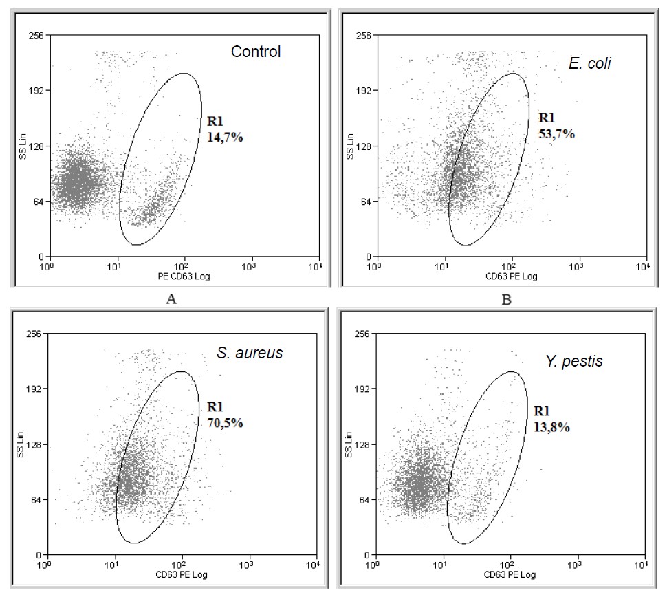 CD63+ granulocytes are localized in the R1 region of cytograms; control is the blood after 2 h without bacteria. The proportion of cells in R1 region is expressed as a percentage of the total number of registered granulocytes.