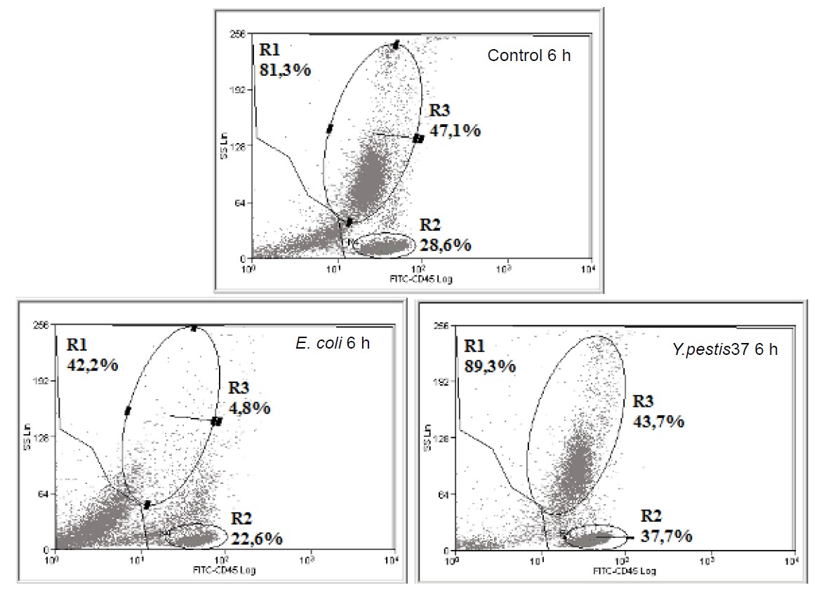 The registered differences in the studied parameters are clearly illustrated by the example of Y.pestis37 and E. coli characteristic cytograms presented in Fig. 1, where granulocytes are localized by the degree of intracellular granularity (intensity of lateral light scattering) and density of CD45 expression in the ellipse-shaped region R3 at their automatic differentiation from lymphocytes and monocytes in control blood samples. In the presence of E. coli, the proportion of granulocytes (cells in the R3 region) decreased after 6 h in the total leukocytic population relative to the control index by 10 times – from 47.1% to 4.8%, and in the presence of Y.pestis37 actually did not change, remaining close to the control (43.8%). In blood contaminated with E. coli, the proportion of granulocytes decreased sharply during this period due to massive lysis of dead phagocytes, significantly increasing the relative amount of signals from cellular debris registered outside the R1 region. On the cytogram of the experimental blood sample with Y.pestis37 cells, the proportion of debris after 6 h of incubation was, on the contrary, lower than in the control without bacteria.