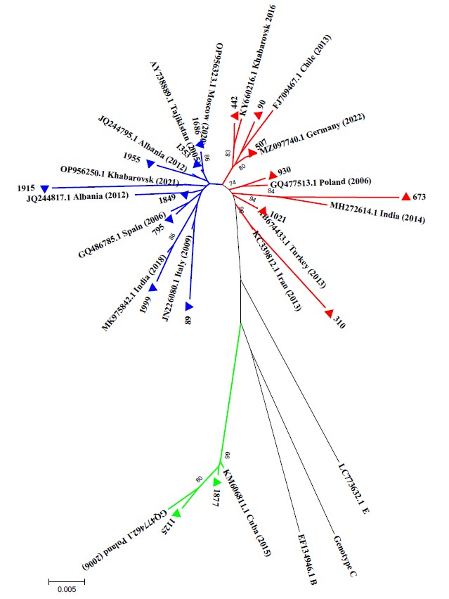 Phylogenetic tree was constructed using the neighbor-joining method. HBV sequences evaluated in current work are marked with triangles. HBV reference sequences are specified by their GenBank accession numbers. Bootstrap index values exceeding 70% are indicated. Blue lines — sub-genotype D2; red lines — sub-genotype D1; green lines — sub-genotype A2.